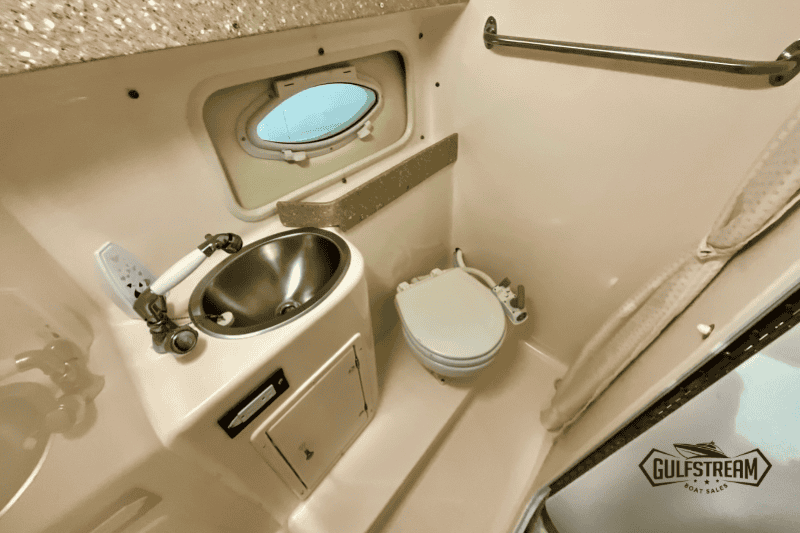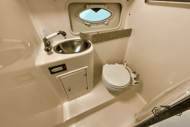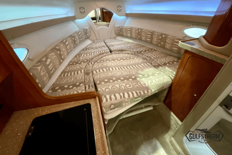 At 30ft long it’s 5 or 6 feet longer than your standard entry level sports cruiser. So that means you get loads of extra space throughout the boat, but especially in the cockpit. It has more head and elbow room in the cabins, it has a larger aft cabin, it has a bigger heads compartment. There’s a larger swim platform than normal. There’s room in the cockpit for a nice little wet bar and there’s tons of seating for up to 10 passengers – which is 2 to 3 more than most entry level cruisers.