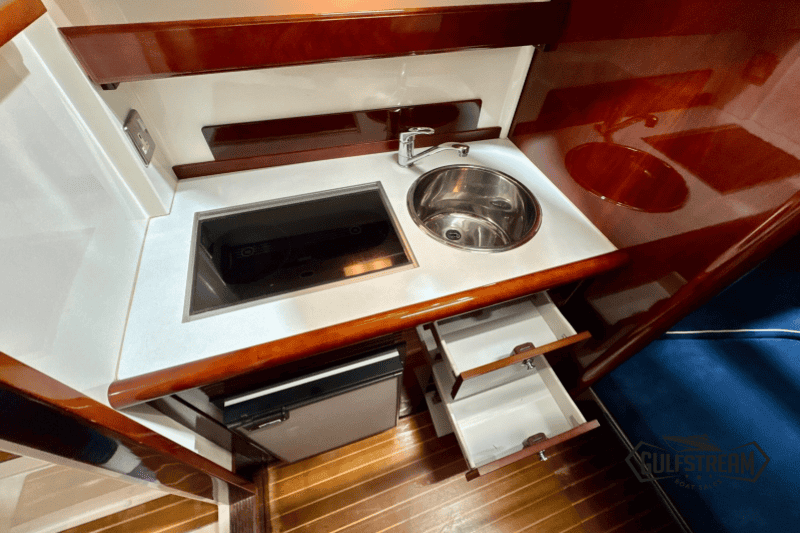 Step inside and you’ll be surprised by how much space has been packed into her 25 feet. A generously sized cuddy cabin forward provides a cosy sleeping space, with a fully enclosed separate heads compartment, a must for longer trips. The well-appointed galley includes a twin-burner Wallas stove (Diesel fired), fridge, and stainless steel sink. With a convertible dinette this boat can comfortably sleep a family of 4. The diesel fired heating and hot water system, along with the fully enclosed cabin, means that this is a comfortable and cosy year-round cruising boat.