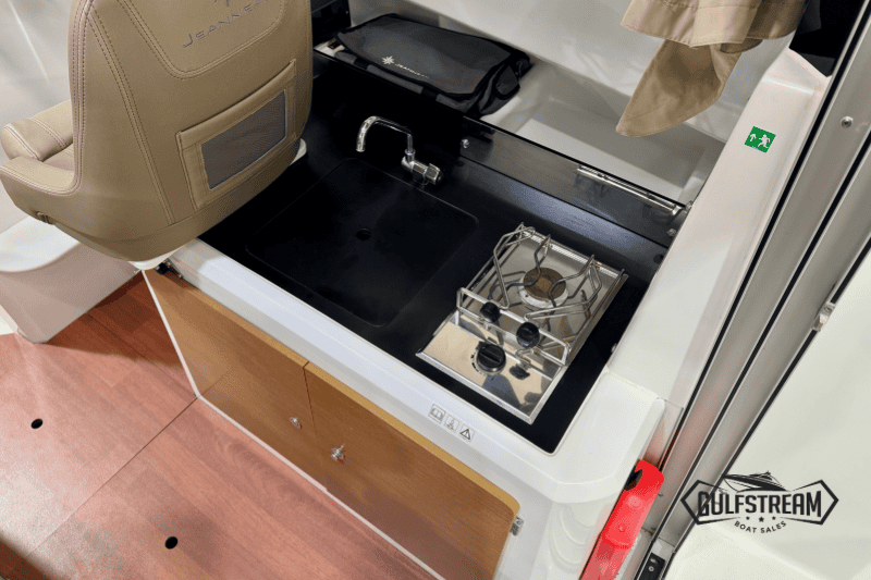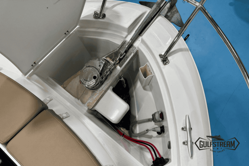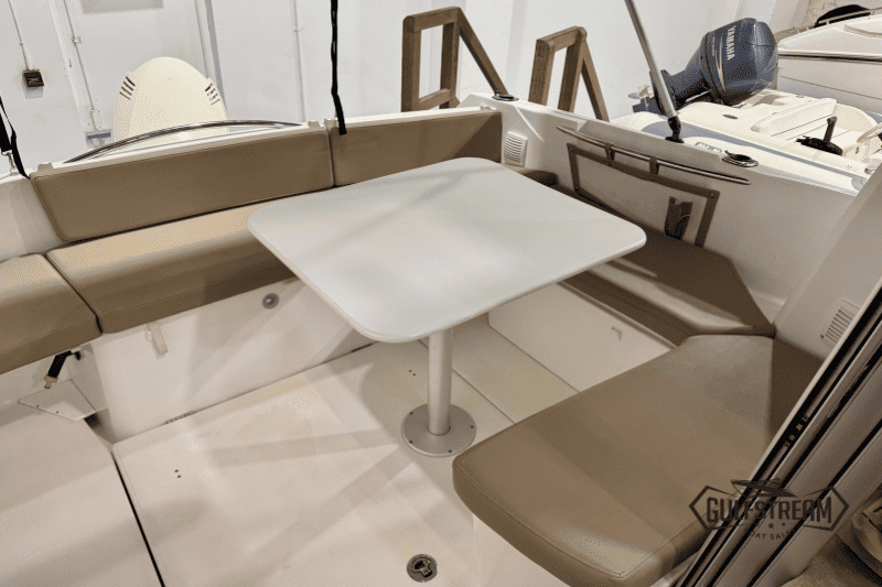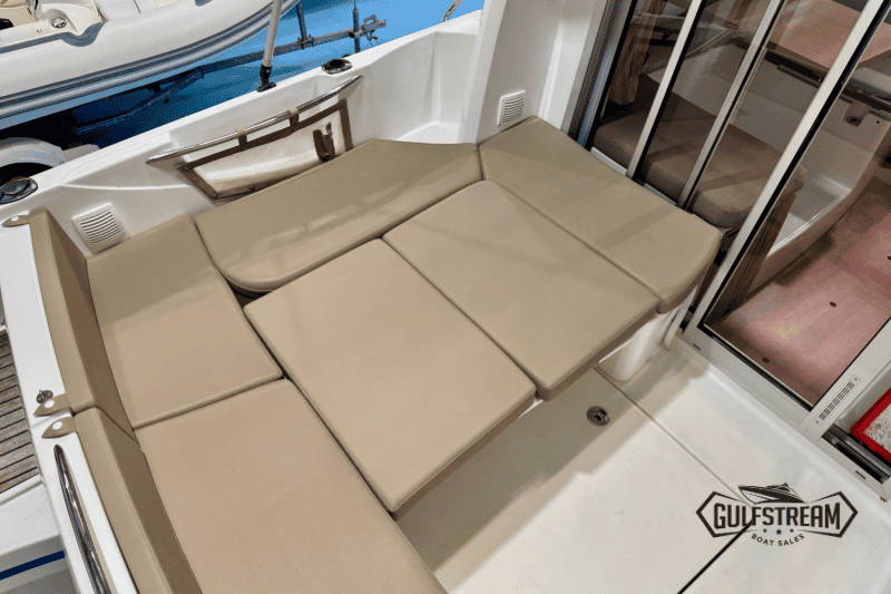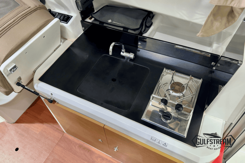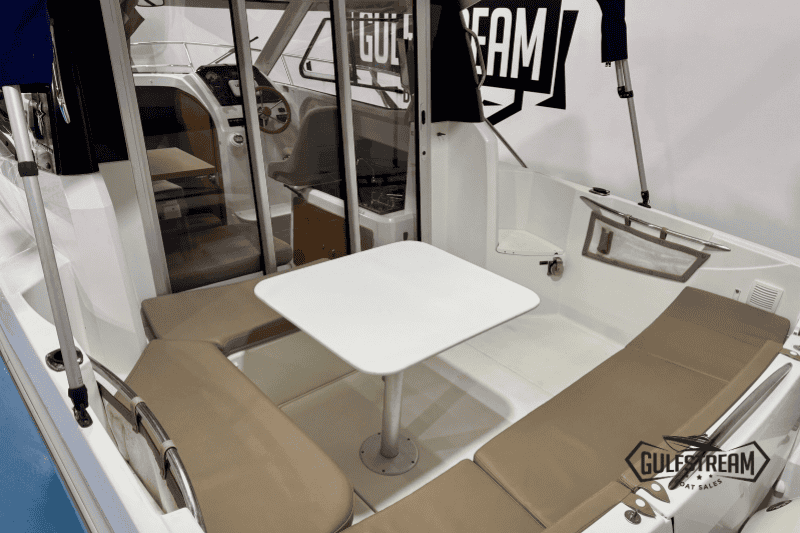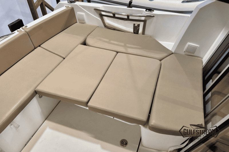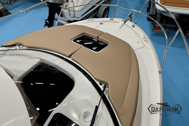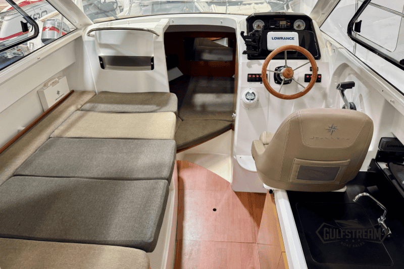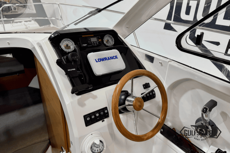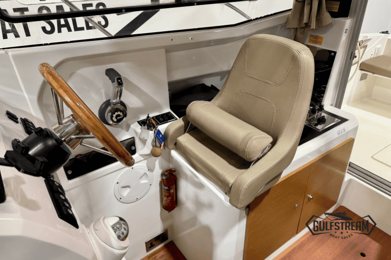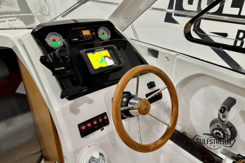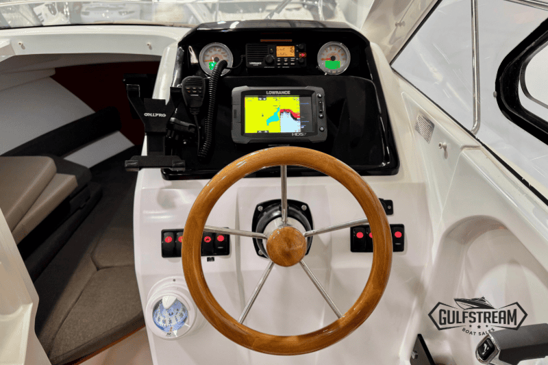 This example is sensibly specified for family use and coastal cruising… it includes a Lowrance HDS7 Chartplotter/fishfinder, Lowrance Link-5 VHF radio, Anchor Windlass and bow and aft sunpad cushions, and Sun Cap Canvas Cover for the Aft deck. It’s a great option for someone who wants a comfortable, easily handled, and easy maintained weekend boat.