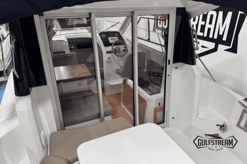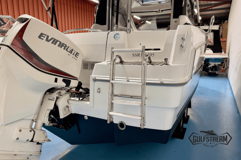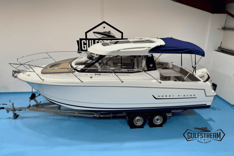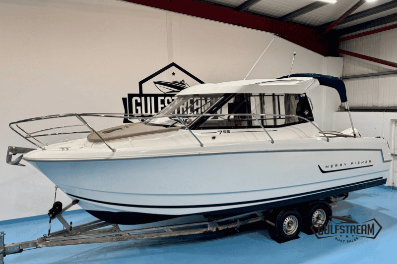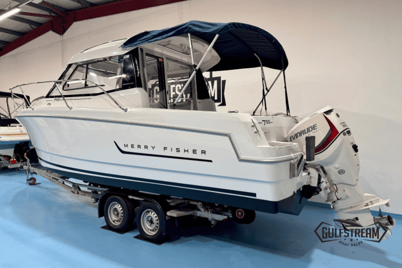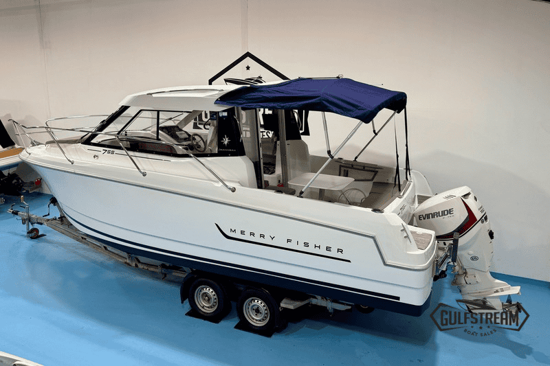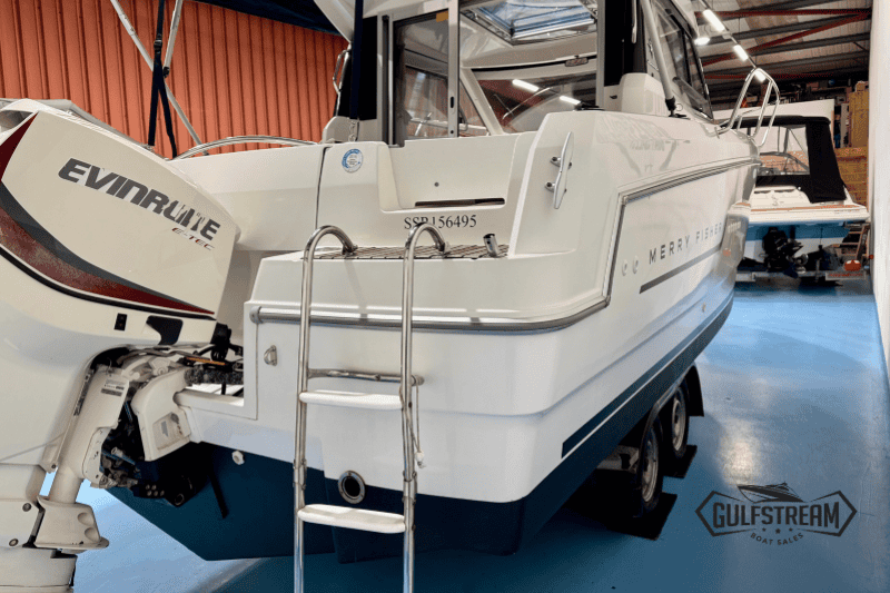 This 2014 Jeanneau Merry Fisher 755 powered by an Evinrude 150 HP E-Tec outboard is an extremely practical family cruiser… tidy, well cared-for and ready for summer days afloat.