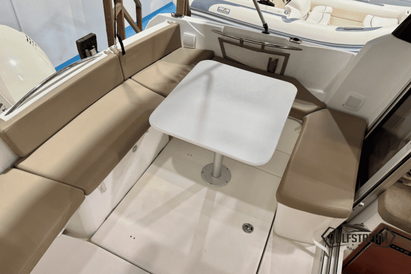 The Merry Fisher 755 is a wonderfully versatile boat: a light-filled pilothouse and cabin with comfortable sleeping for up to four, a compact galley and an enclosed heads compartment make weekend escapes easy, while the cockpit is laid out for social days and active fishing alike. The wrap-around lounger seating in the cockpit sits around a large table that converts to a generous sunpad; stow the cockpit seating and you instantly have a large aft deck for fishing or carrying extra gear. Handling is simple with the single Evinrude 150HP outboard giving confident cruising speeds and easy manoeuvring.