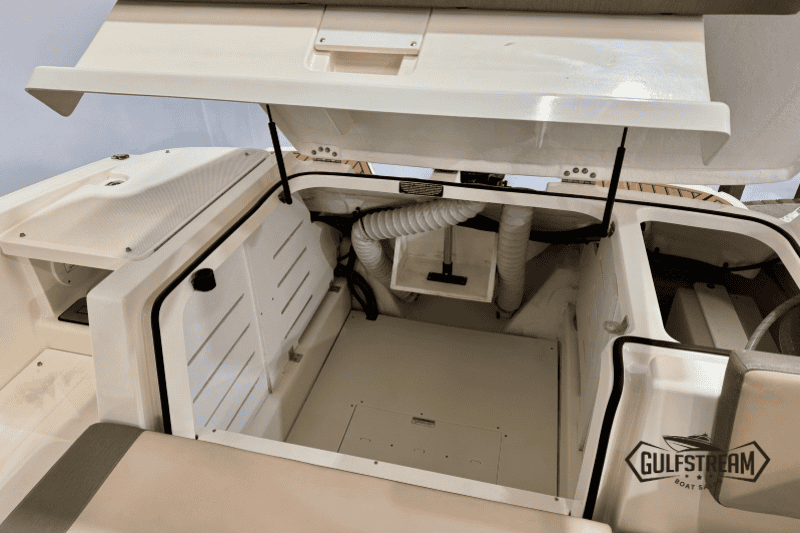 There are two fantastic seating areas in the bow and cockpit, easily accommodating up to 9 passengers plus gear. The cockpit features a sociable L-shaped lounge around a removable table, a wide transom walk-through, full-width aft sun-lounger, closeable bow walk-through, and an exceptional amount of cleverly designed storage — including in-floor ski storage, deep under-seat lockers, and even a separate enclosed toilet compartment… perfect for long days on the water!