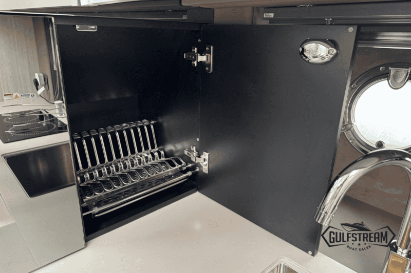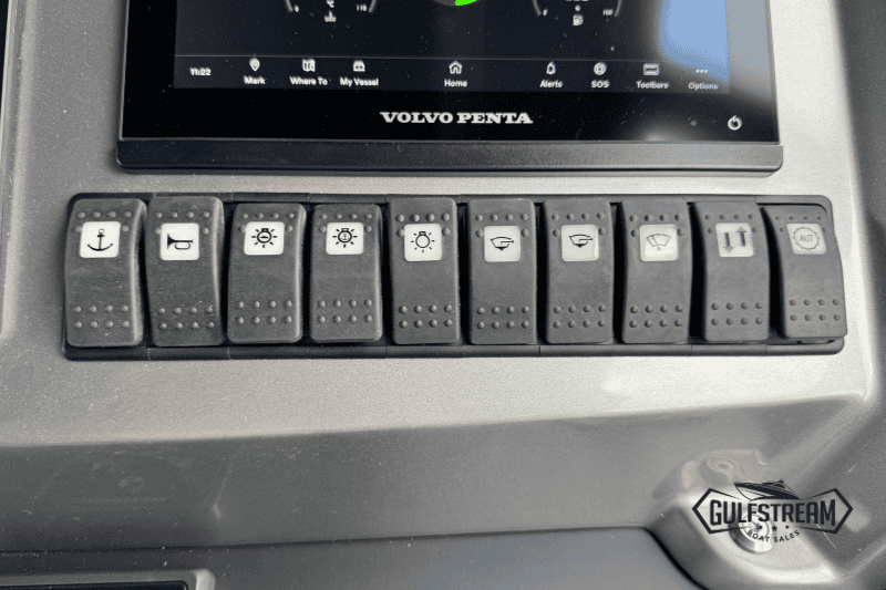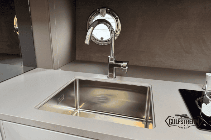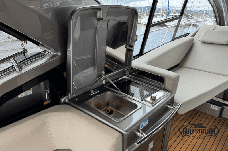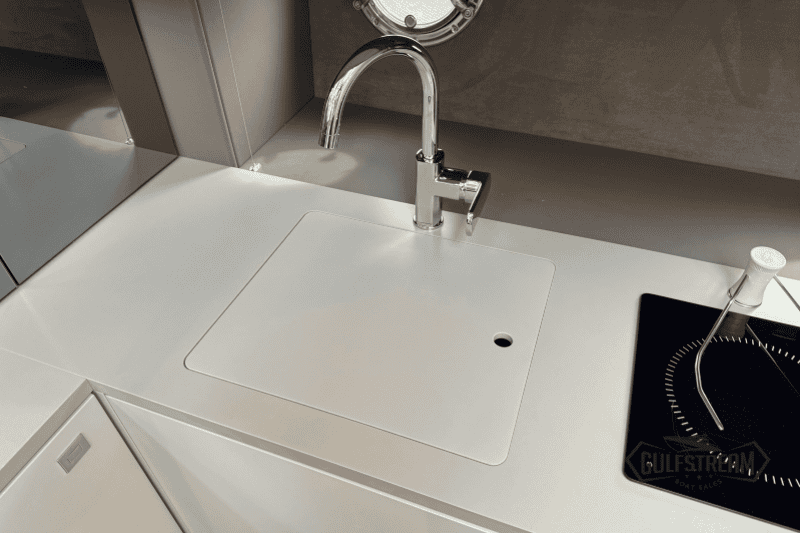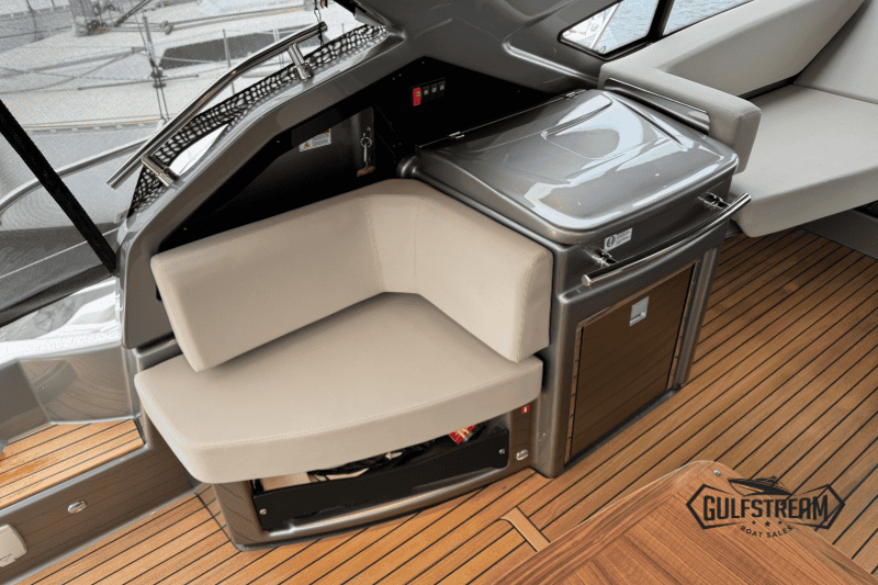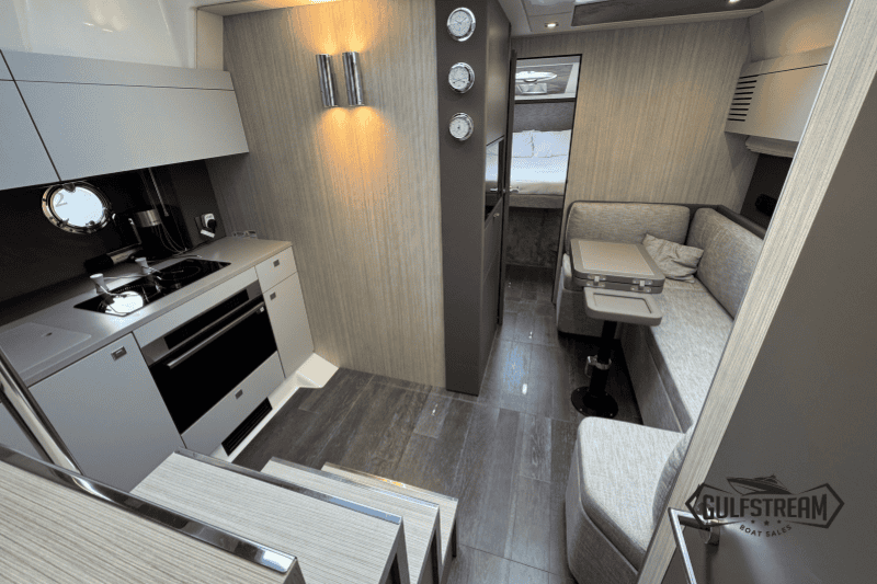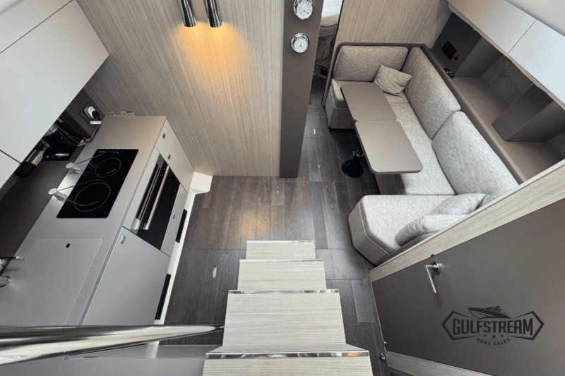 The helm station with it’s modern dash, matt black finish, high quality steering wheel and digital controls + joystick has the feel of a sporty cockpit. The ergonomics and visibility from the helm are excellent. This is a boat that is a lot of fun to pilot and makes you feel as special as the boat looks!