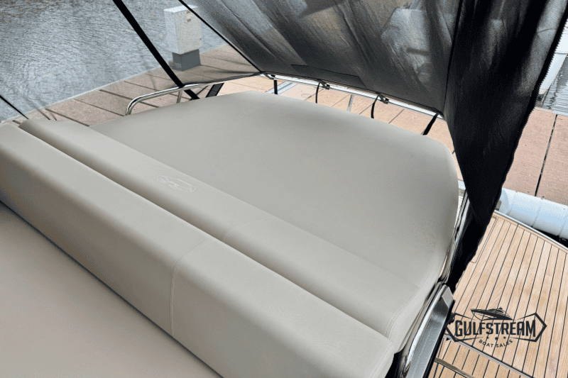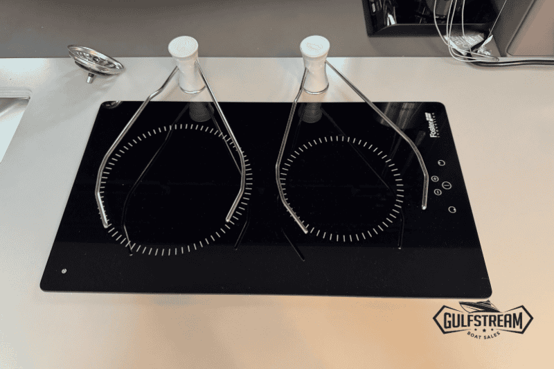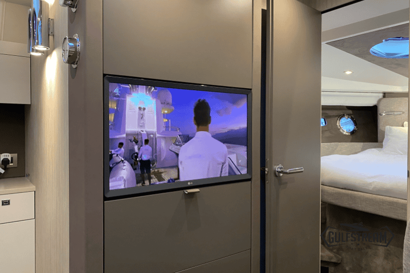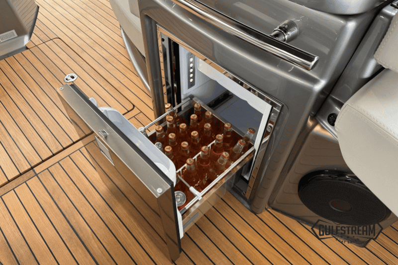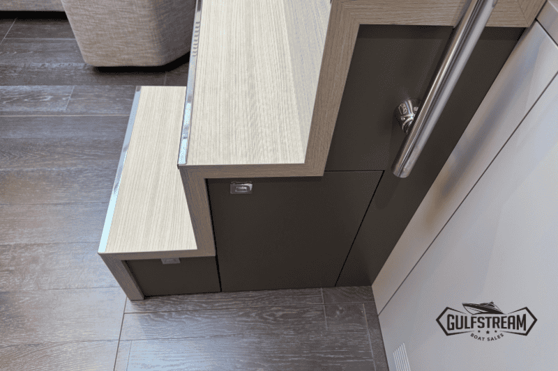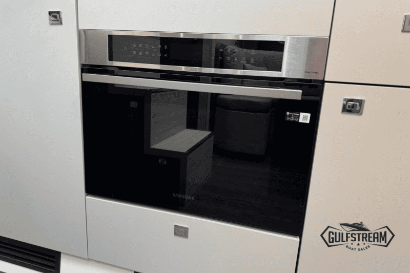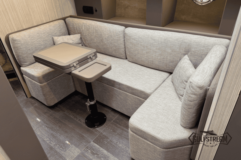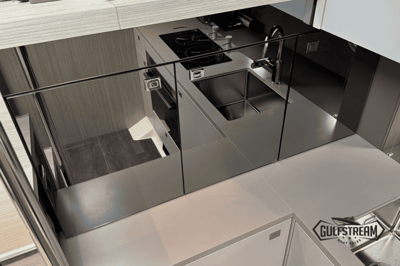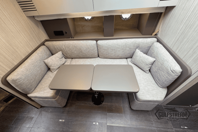 The helm station with it’s modern dash, matt black finish, high quality steering wheel and digital controls + joystick has the feel of a sporty cockpit. The ergonomics and visibility from the helm are excellent. This is a boat that is a lot of fun to pilot and makes you feel as special as the boat looks!