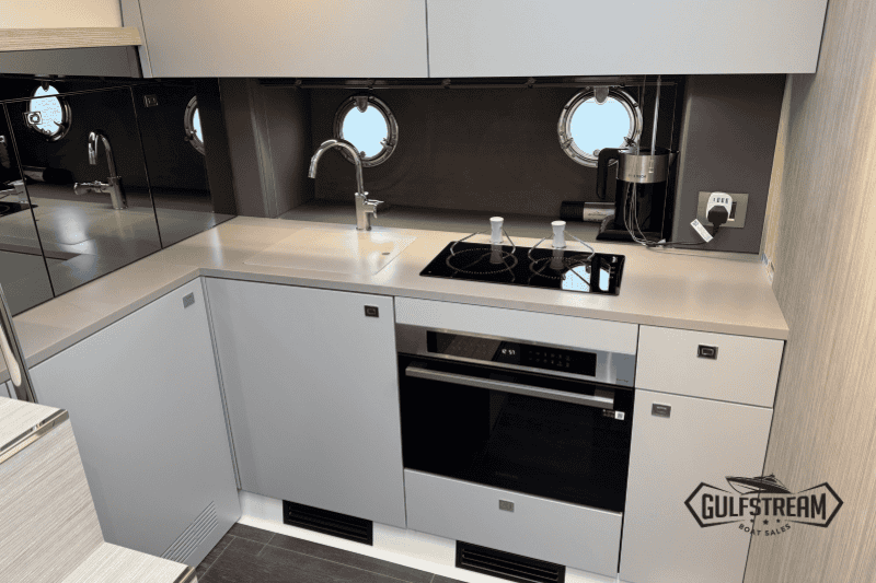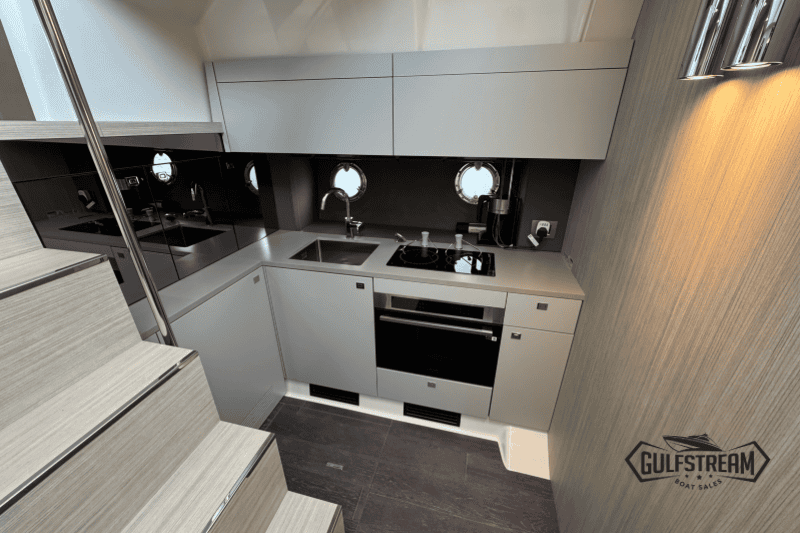 The interior accommodation of the Cranchi M44 is beautifully appointed, feeling more like a modern luxury apartment than a boat! With large hull side windows and overhead roof lights, the whole area below decks is flooded in natural light. There’s a spacious galley on the port side of the saloon and a comfortable sofa (which converts to a berth) on the starboard side.