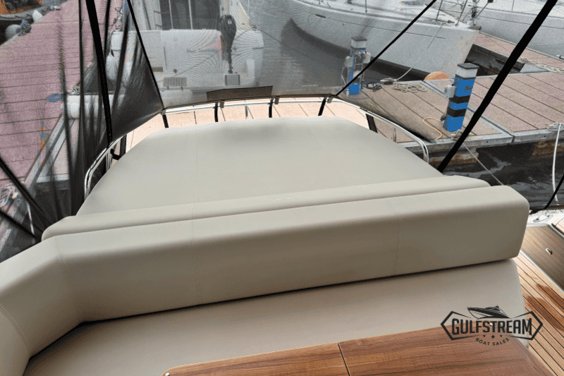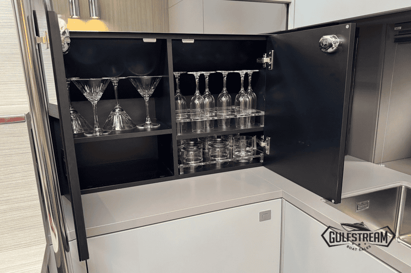 When the sun is shining and the roof open, the cockpit is flooded with sunlight and there’s plenty of sun lounging space both on the aft sunpad and the portside chaise-longue, opposite the helm. The cockpit wetbar, with fridge and grill, is perfect for preparing al-fresco drinks and nibbles.