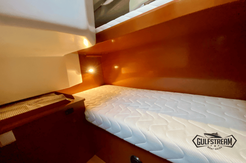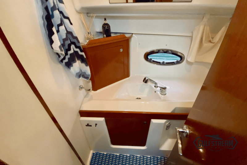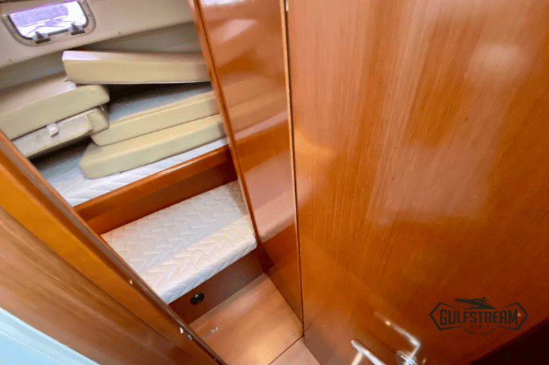 Forward, the master cabin offers a generous island double berth, while the guest cabin provides a pair of twin bunks… ideal for children or visiting friends. The heads compartment is spacious and features a proper shower area, marine electric flush toilet, and holding tank, all fitted out to Beneteau’s typically high standard.