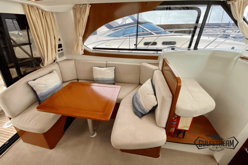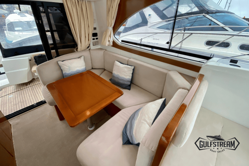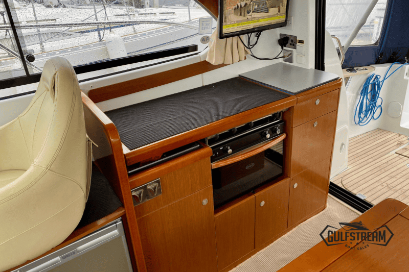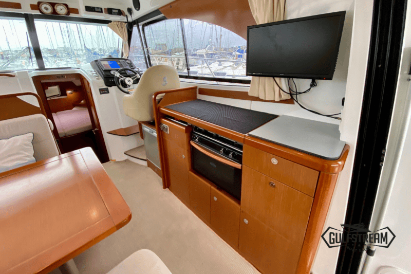Step inside and the Antares 30 immediately impresses with her bright, airy saloon and warm wood finishes, striking a fine balance between practicality and comfort. The large windows flood the space with natural light, while the saloon seating area converts easily to create an occasional double berth. The galley is neatly equipped for weekends or longer cruises, with a gas hob, oven, microwave, refrigerator, sink, and plenty of storage.