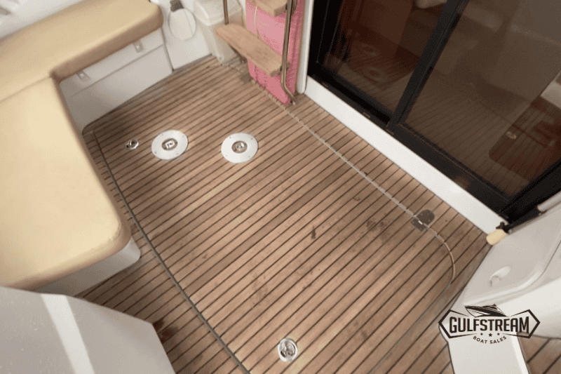 Up on the flybridge, the centrally positioned helm gives excellent visibility all around, making for easy berthing. There’s plenty of space for guests to relax too, with a comfortable sunpad area and seating for socialising while underway or at anchor. Down below, the wide side decks, deep cockpit, and high stainless rails all around the boat give a secure feeling on deck.