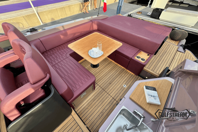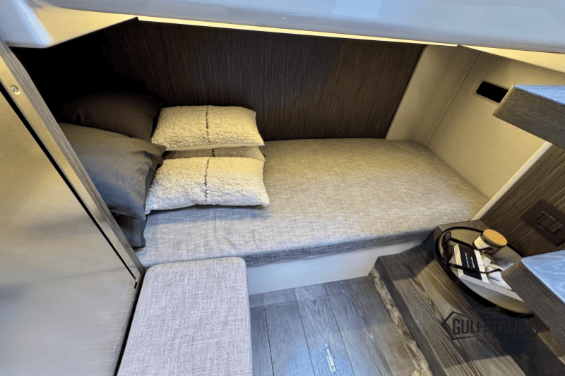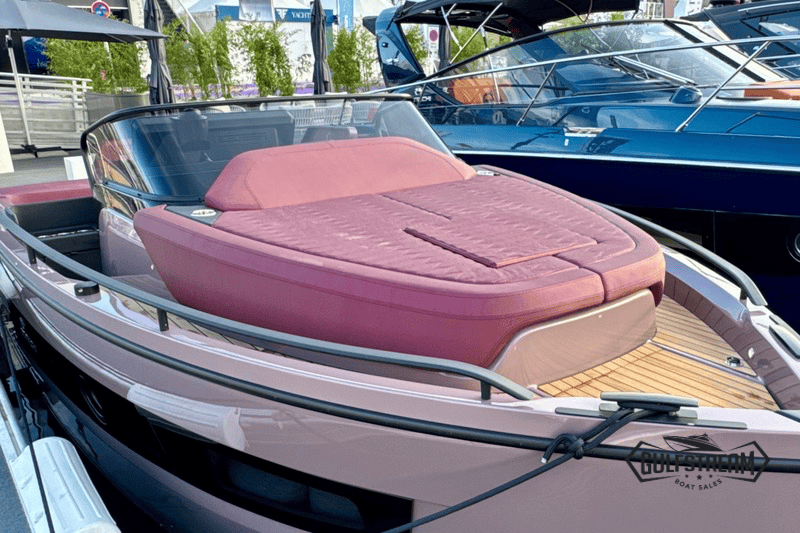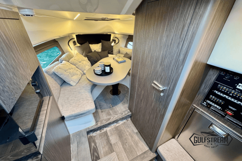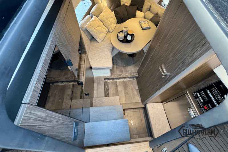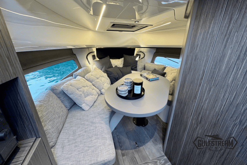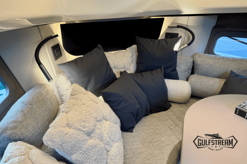 At the stern you’ll find a clever beach club arrangement, created by folding down the port side gunnel to form a wide swim platform area – a floating oasis that makes the water more accessible than ever. Moving forward, the cockpit has been designed for sociability, with generous wraparound seating, a convertible dinette, and comfortable helm and co-pilot seats. The bow is equally inviting, offering a spacious sunbathing area to stretch out and relax.