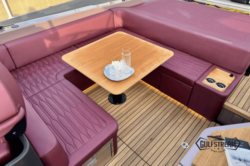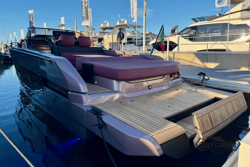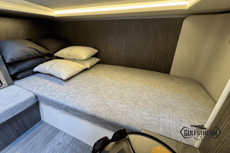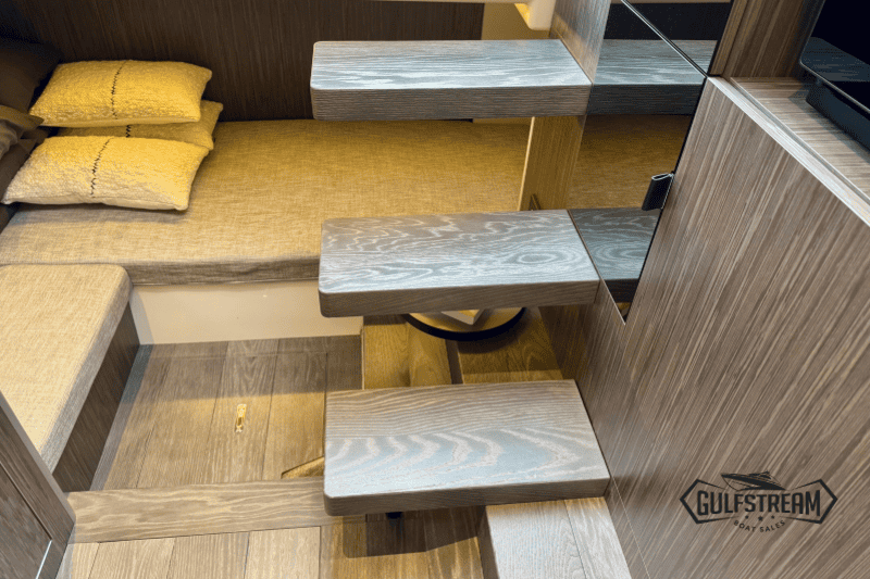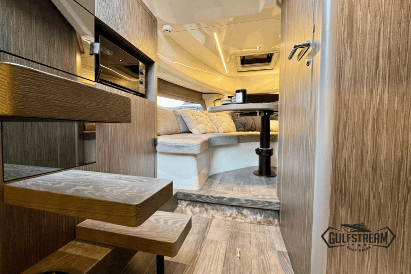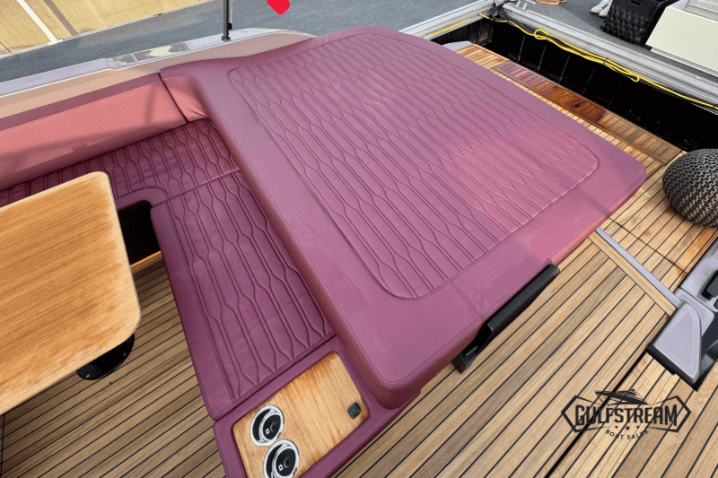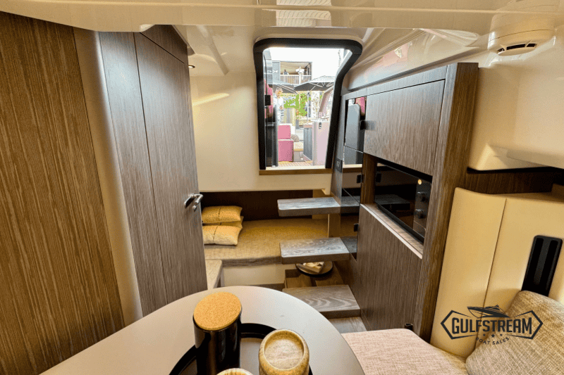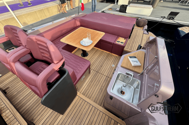 At the stern you’ll find a clever beach club arrangement, created by folding down the port side gunnel to form a wide swim platform area – a floating oasis that makes the water more accessible than ever. Moving forward, the cockpit has been designed for sociability, with generous wraparound seating, a convertible dinette, and comfortable helm and co-pilot seats. The bow is equally inviting, offering a spacious sunbathing area to stretch out and relax.