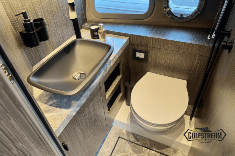 Below deck, the A32 feels every inch a larger yacht. The cabin and separate bathroom are finished with the same sophisticated touches found across the Cranchi range, including oak plank flooring and a marble vanity top. Large windows and clever design create a welcoming, light-filled atmosphere, ideal for overnight stays or longer adventures.