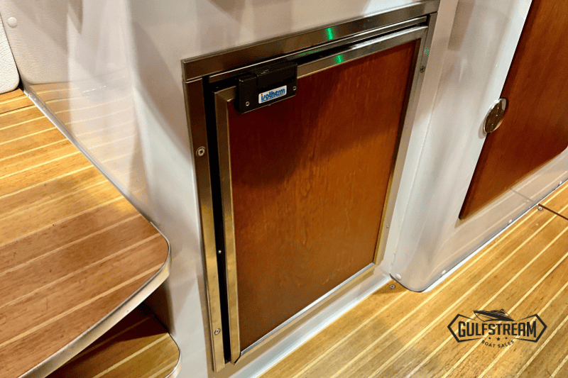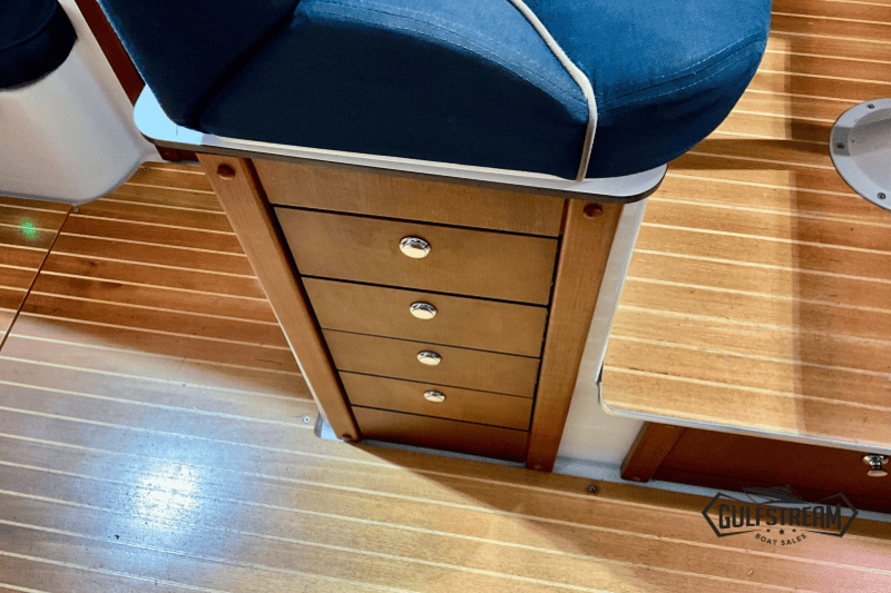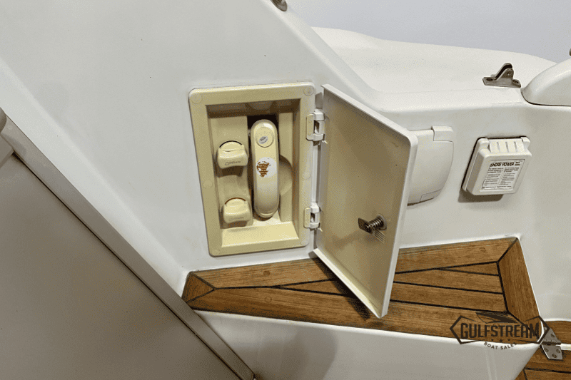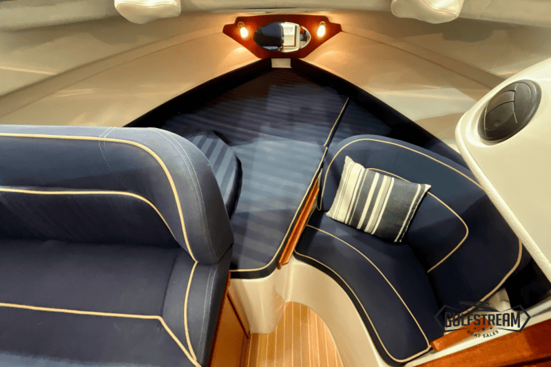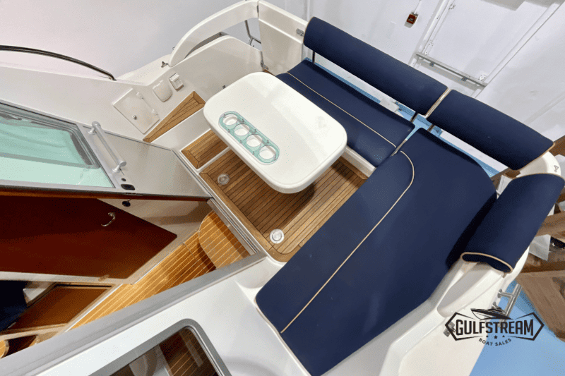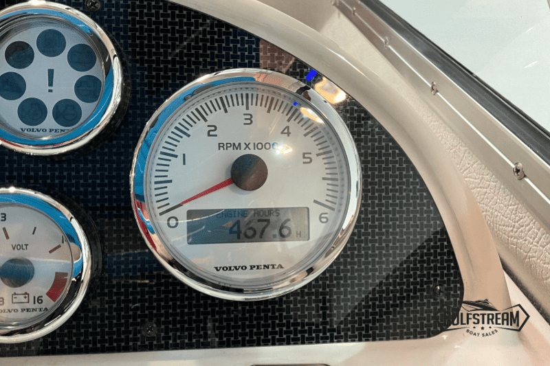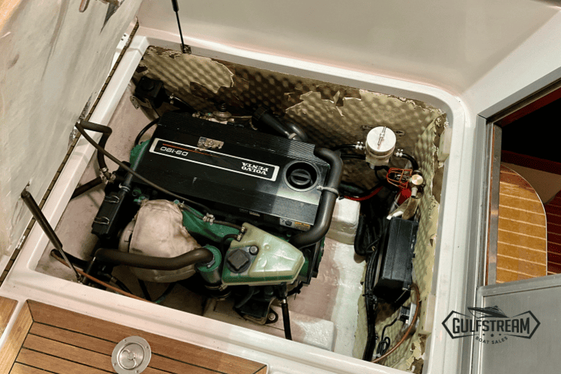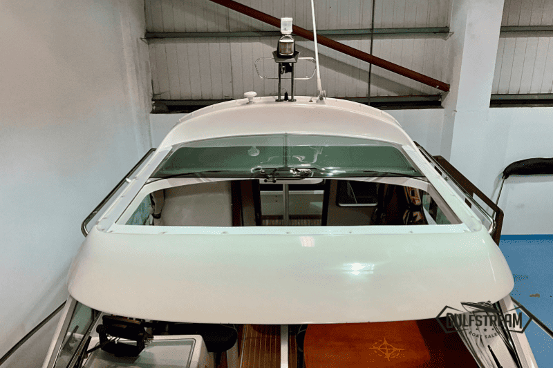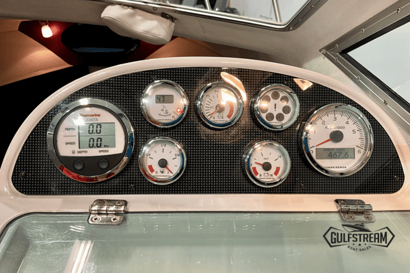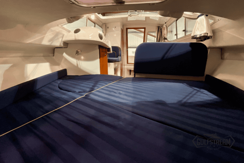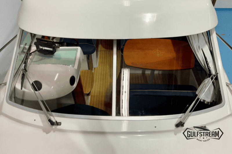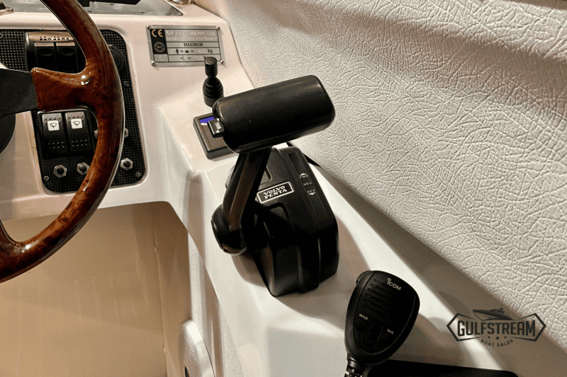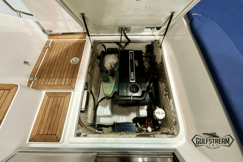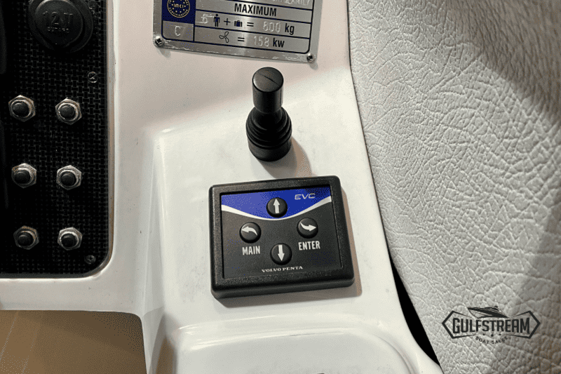Her fantastic spec level includes a Bow Thruster, Garmin GPS Chartplotter, ICOM VHF Radio, Fusion Bluetooth Stereo, Shore Power, and Camper Canvas Covers for the aft cockpit.