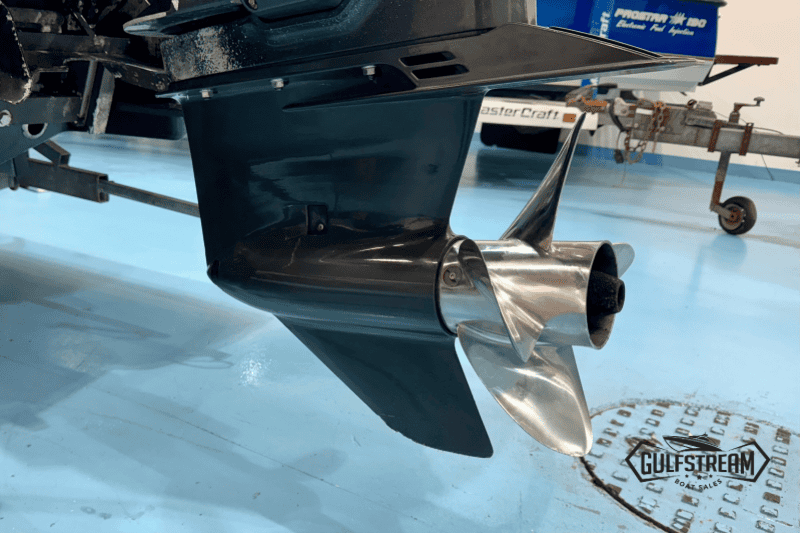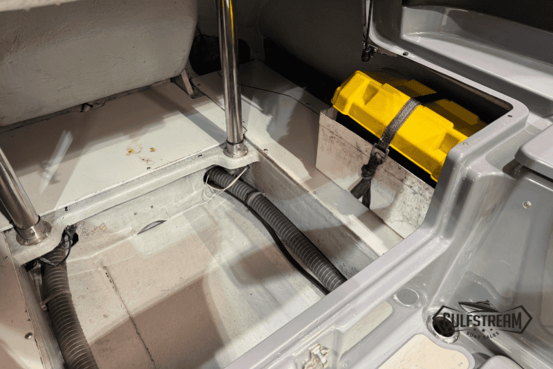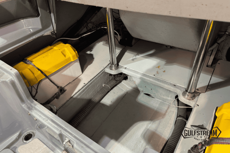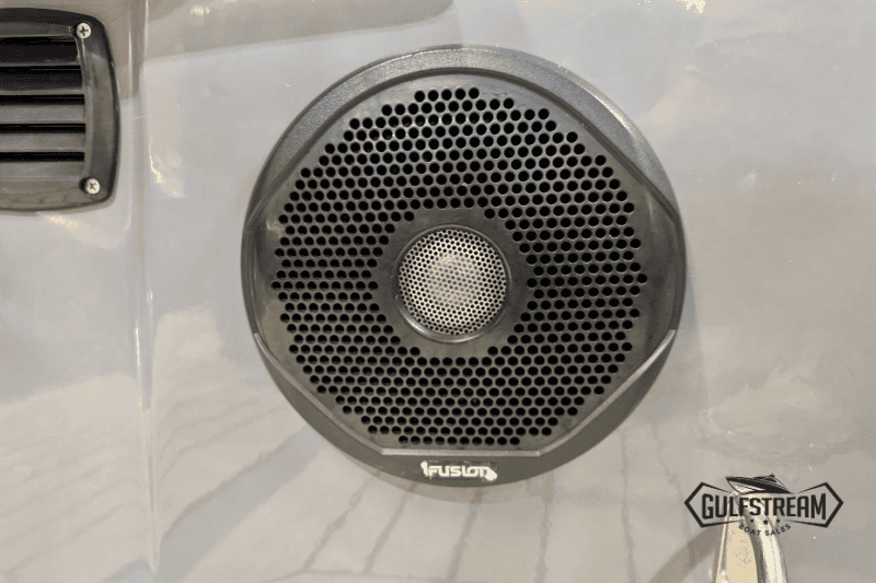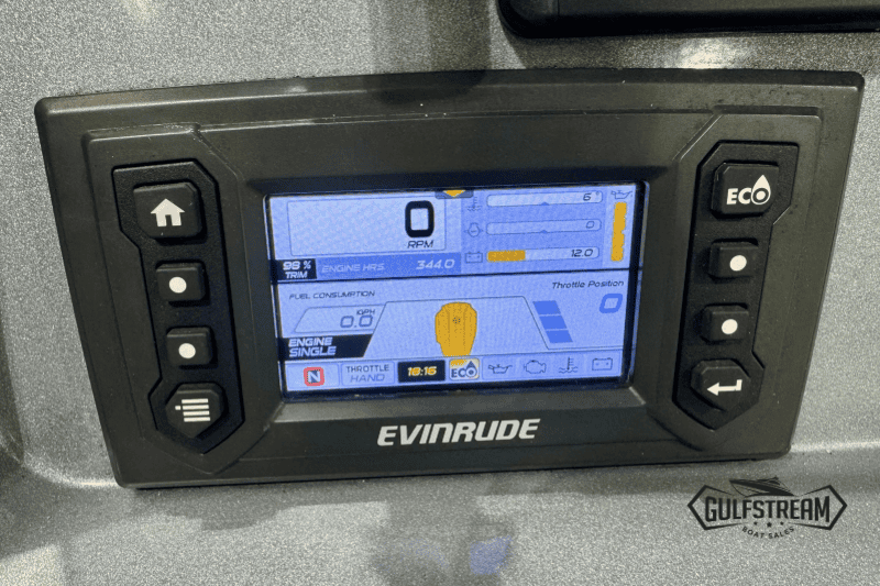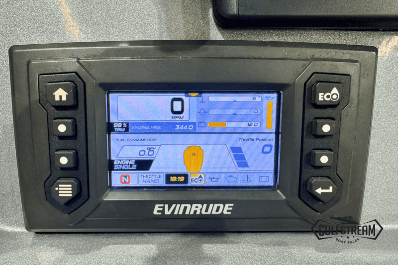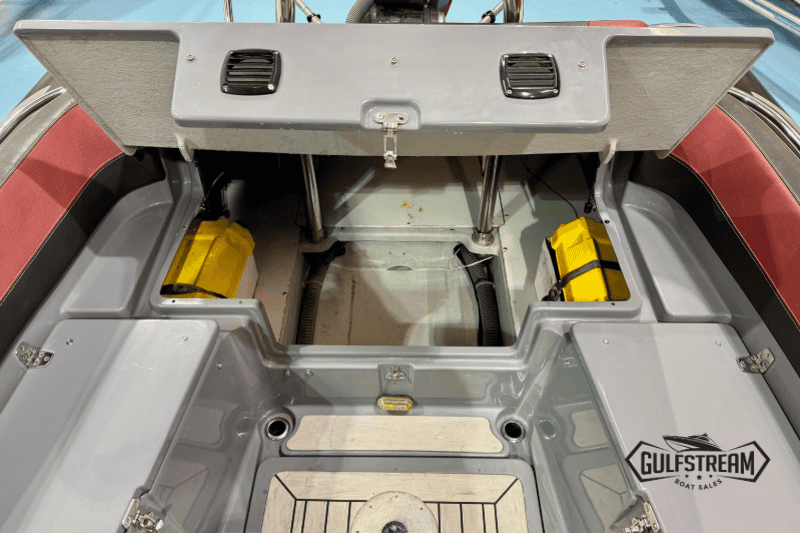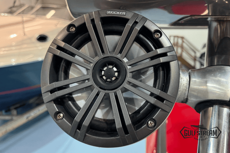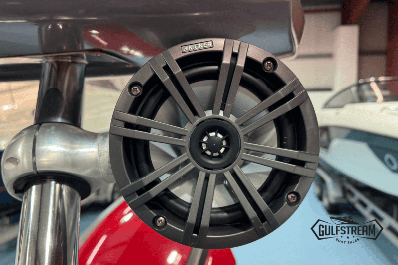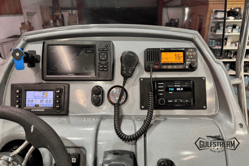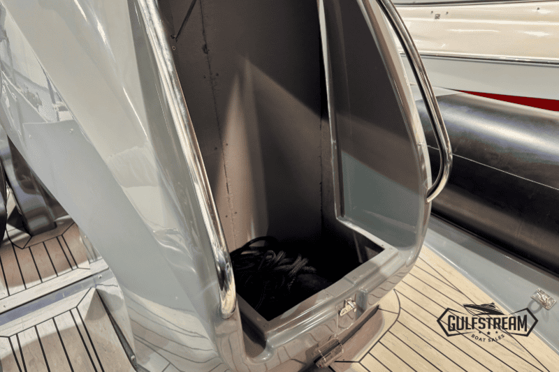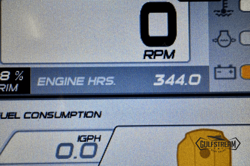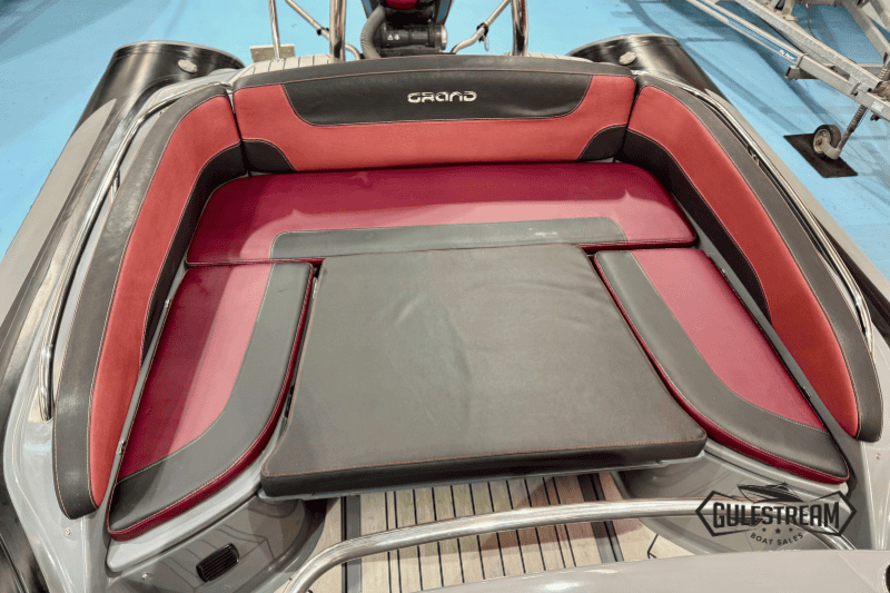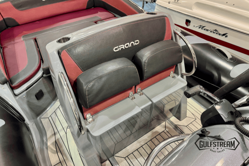 The spec list includes everything you need to hit the water: Garmin GPS Chartplotter/Fishfinder, Kicker Bluetooth Sound System, ICOM VHF Radio, Waterski Towing Arch, and just about every available factory option… including sun pad cushions (fore and aft), cockpit table, full covers pack, synthetic teak decking, etc, etc.