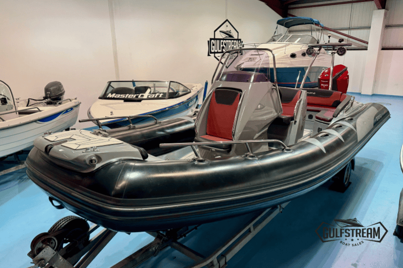 This is a really smart looking rib. With the black and grey tubes, grey teak decking and deep red upholstery, it really stands out from the crowd. It’s loaded with spec, has just been serviced by our local Evinrude agent and is ready to go for the 2025 season. Complete with roller coaster trailer.