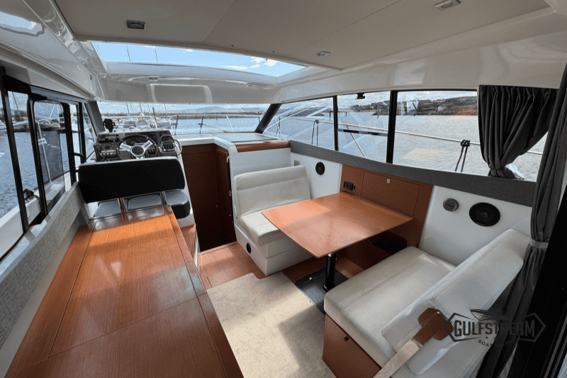 The light-filled saloon features large panoramic windows, a sliding glass sunroof, and wide sliding doors that open out to the cockpit. The helm-side sliding door gives quick access to the side deck, making docking and line handling much easier… especially when cruising short-handed.