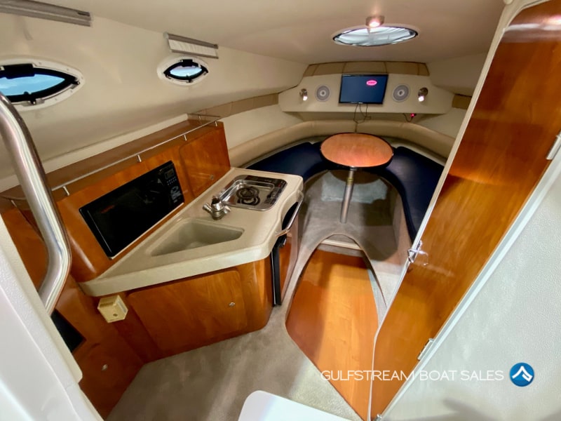 The fold away bench seat at the transom means that you can easily clear the deck if you’re swimming or wakeboarding off the back of the boat. The fold flat sun lounger on the port side makes a huge area for sunbathing or lounging around and the cockpit wet-bar means you can easily entertain upstairs without traipsing up and down stairs to the galley.