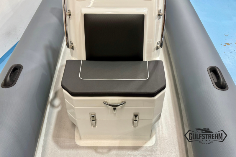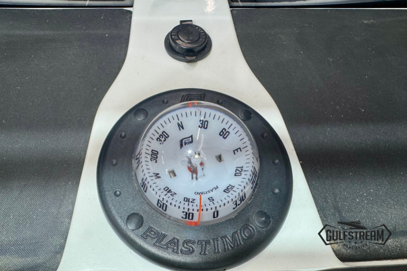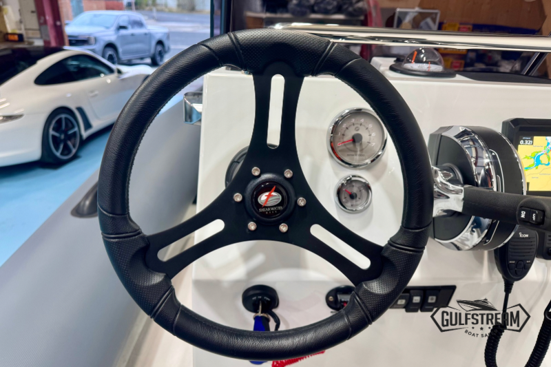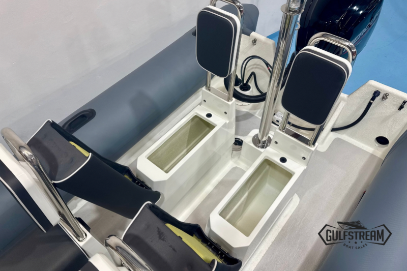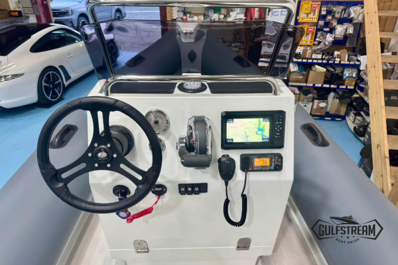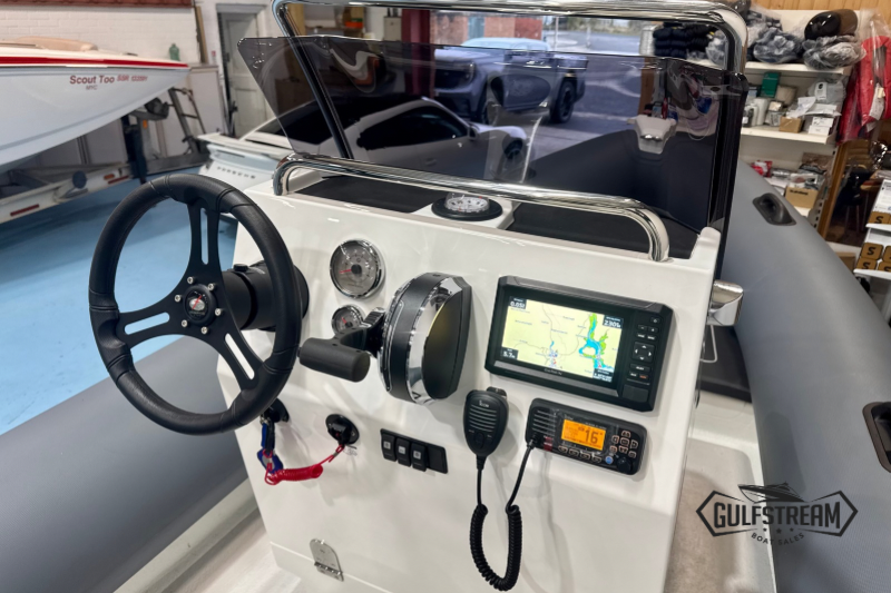 The console has plenty of space for port or starboard steering and can accommodate large navigation units and electronics. Its 8mm windscreen with stainless steel rail gives good protection from wind and spray. Tucked under the screen is a moulded compass plinth and handy recessed shelf for phones etc and space for a charging point.