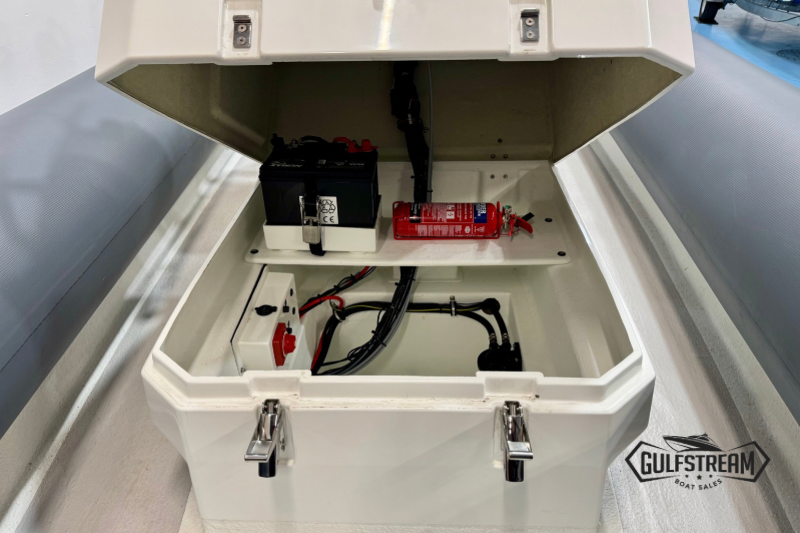 The console hinges to give full access to the internal space, which is huge! The battery fixing point is high in the console keeping it dry and away from water ingress.