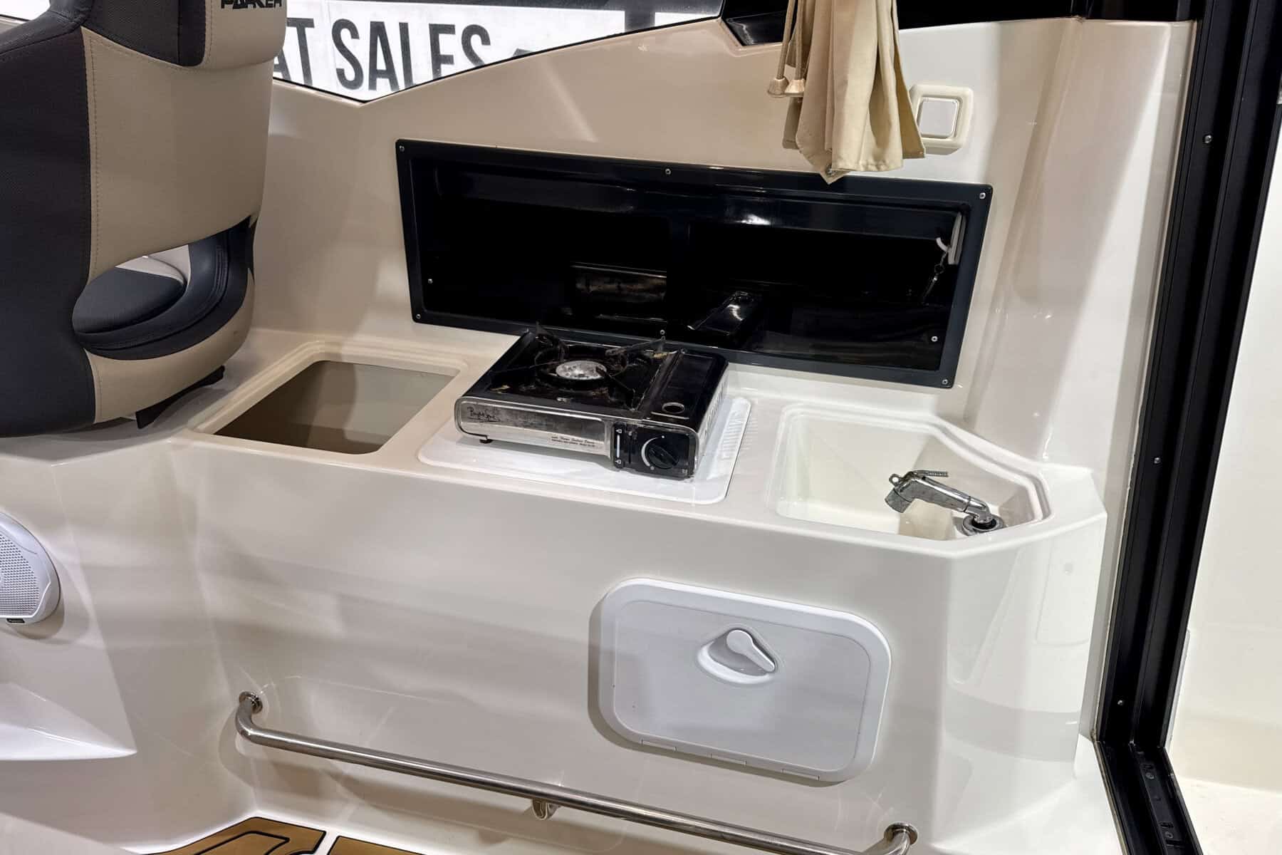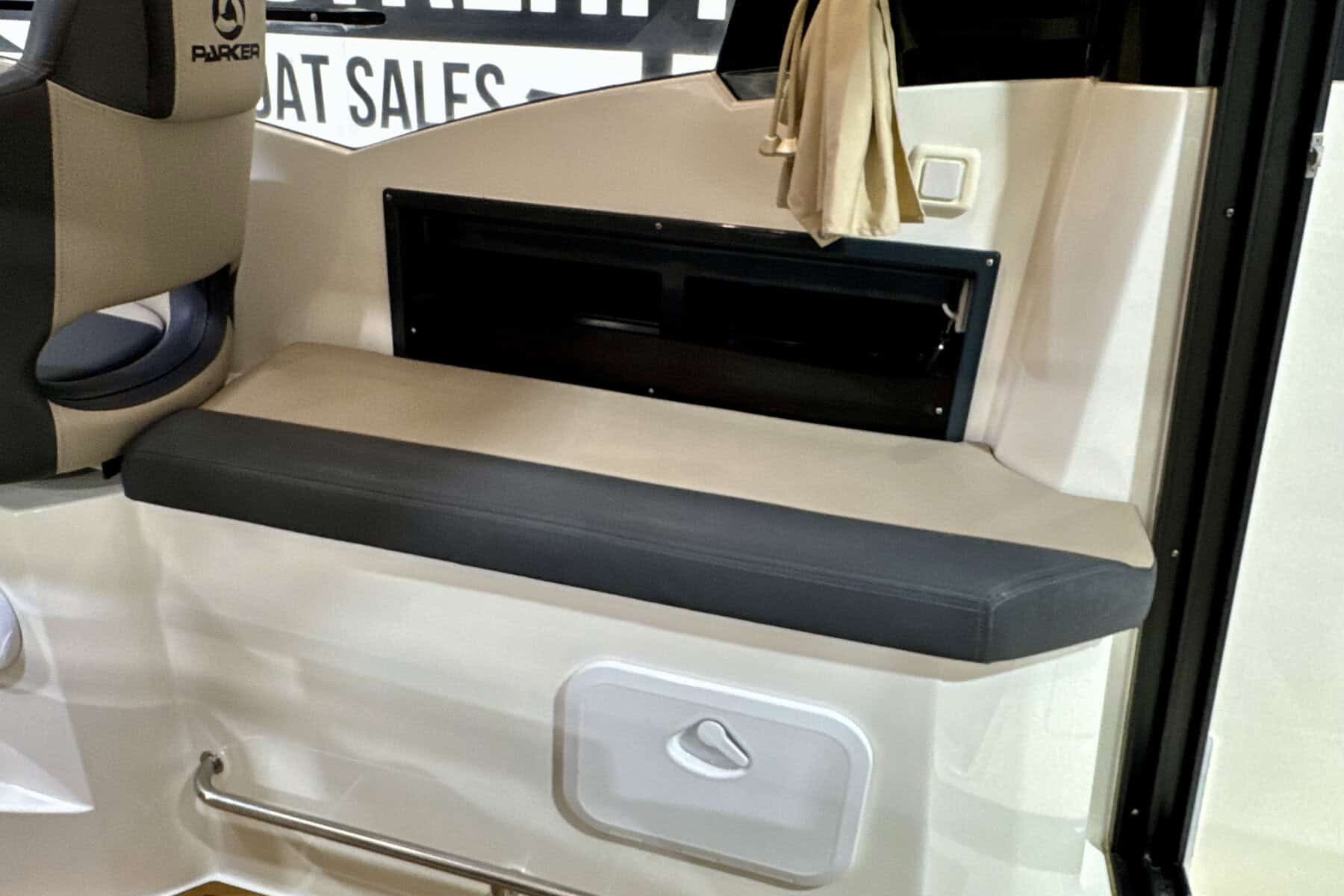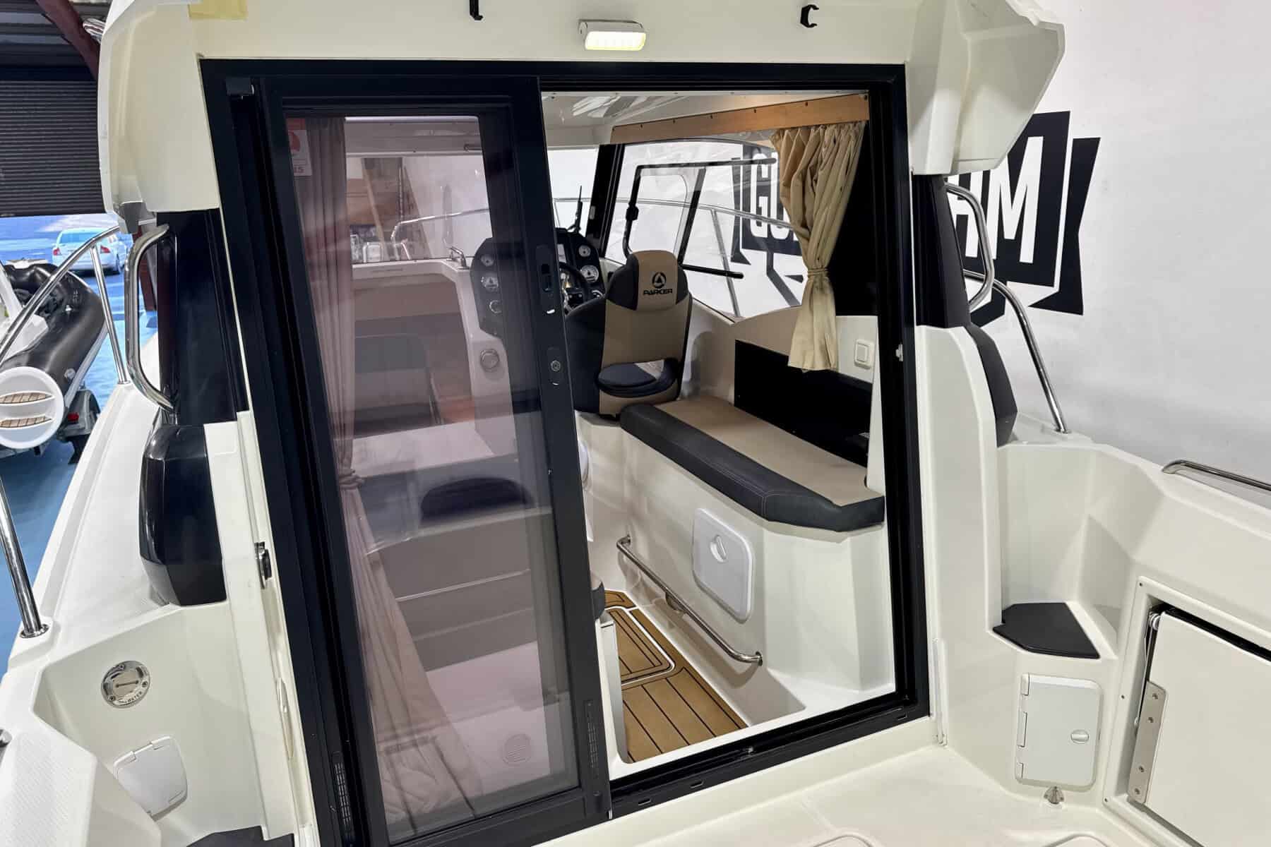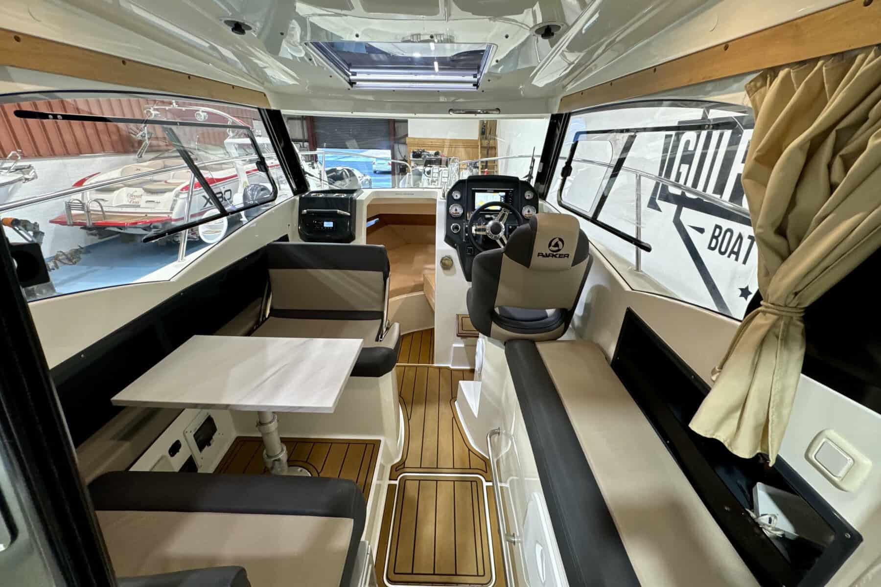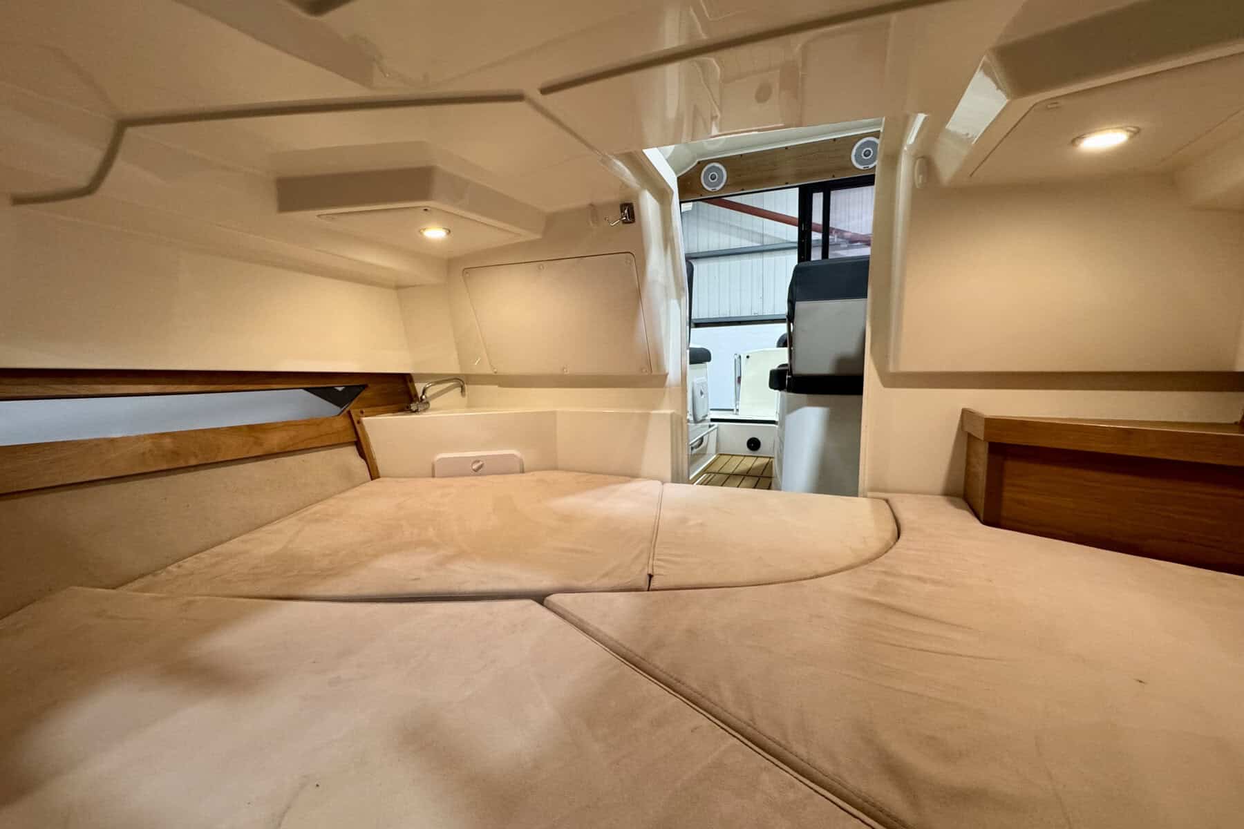 Below decks, the Parker C75 continues to impress with intelligent use of space. The cabin is bright and welcoming, with a comfortable forward berth, practical storage solutions, a manual flush toilet and small sink. It’s a compact but very usable interior, ideal for weekends away or overnight coastal adventures.
