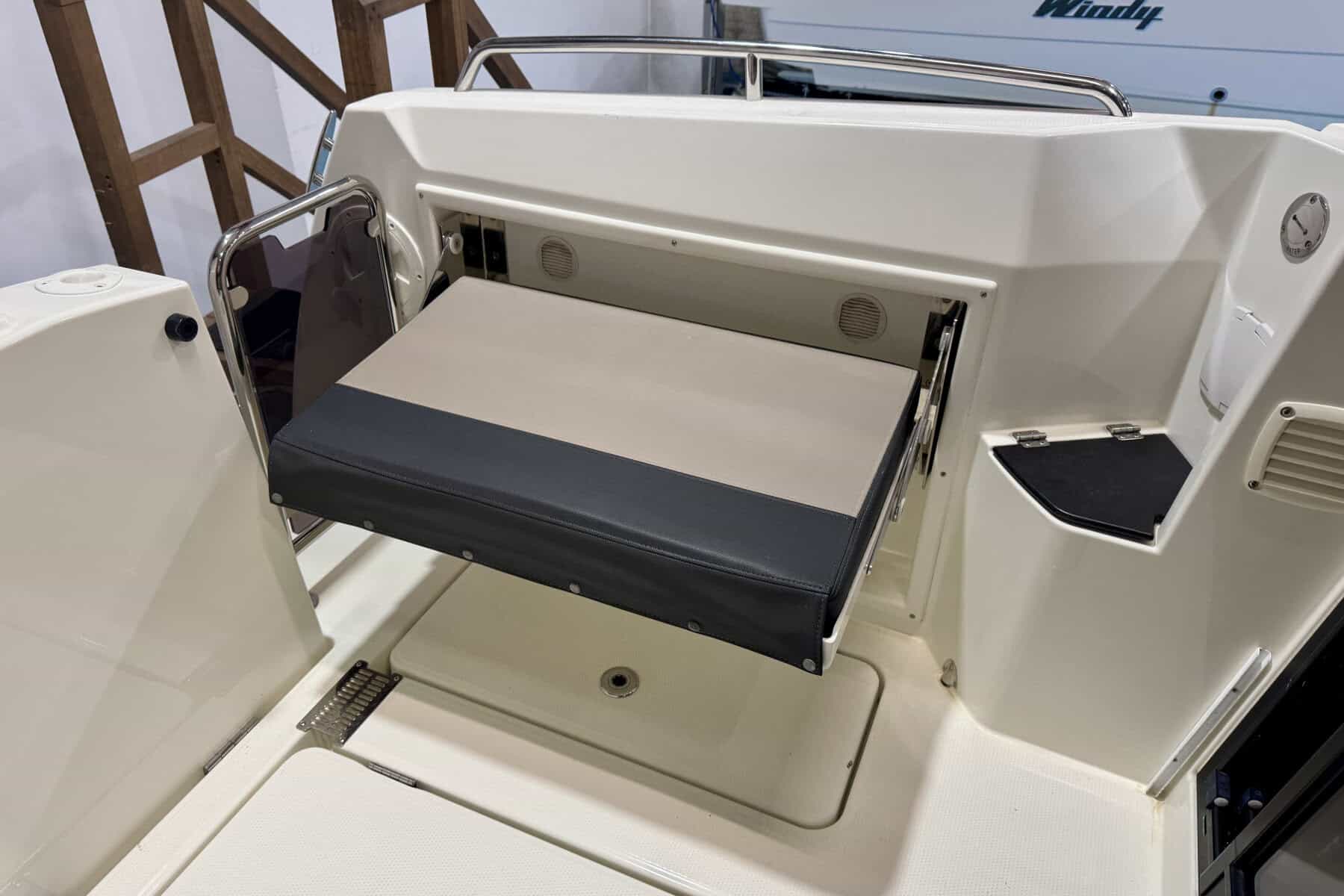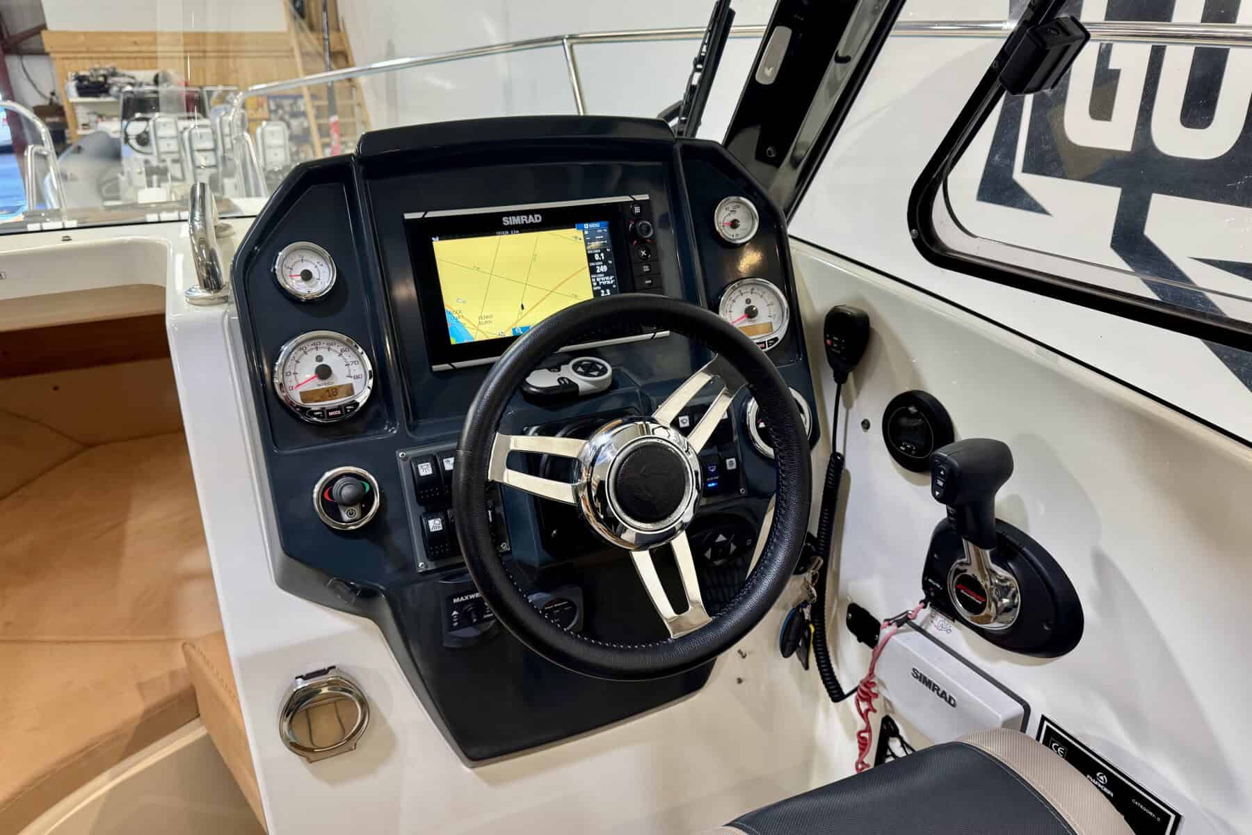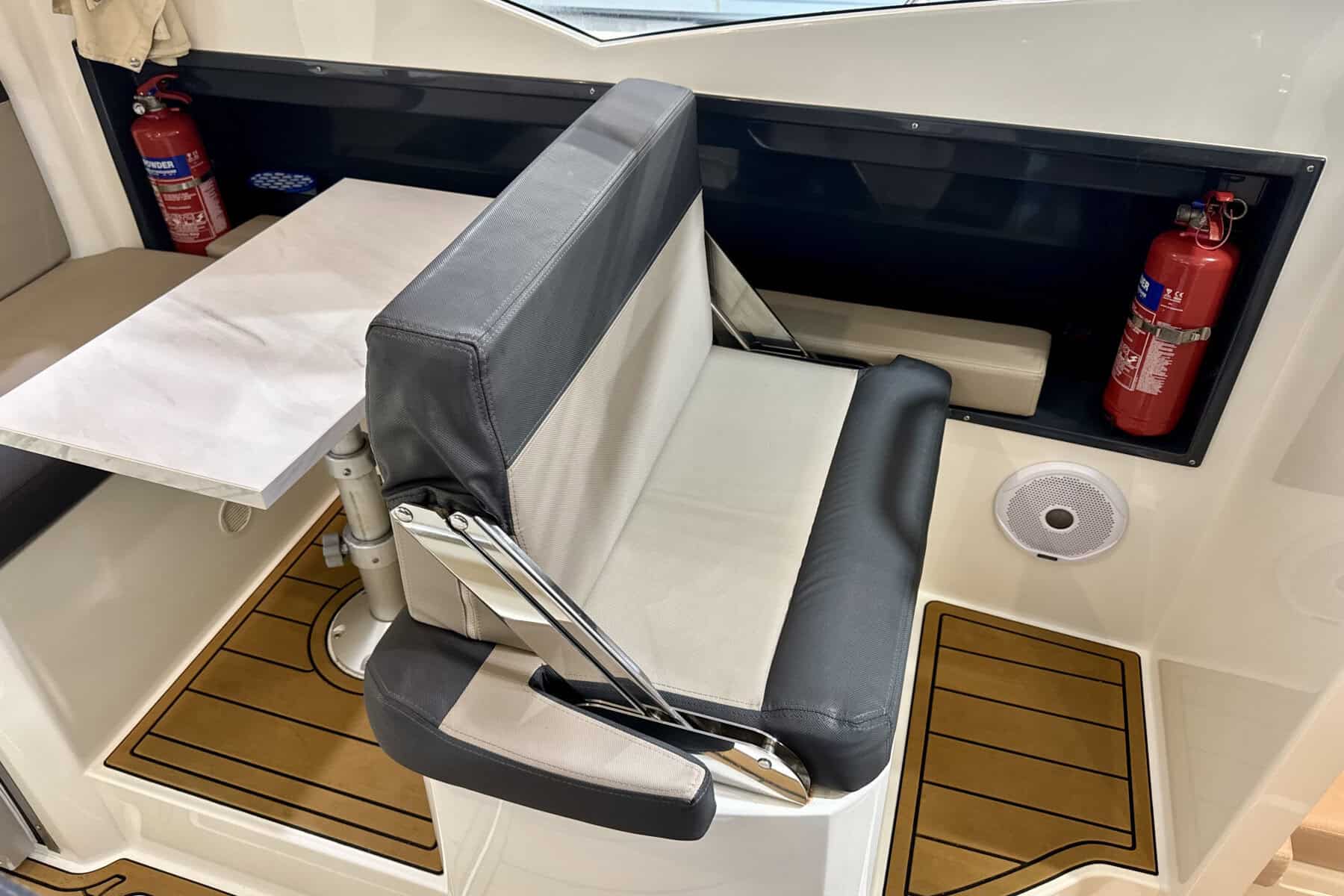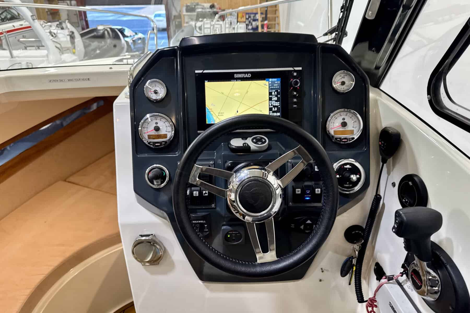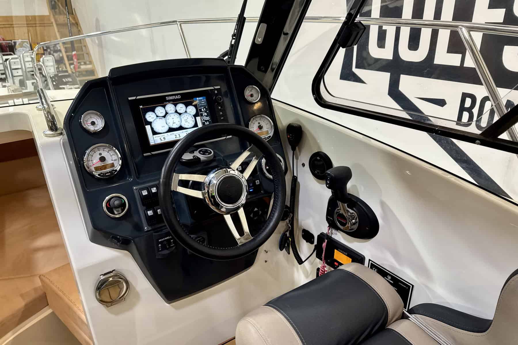 At the helm, everything falls neatly to hand. Clear sightlines, sensible ergonomics, and straightforward instrumentation create a driving position that inspires confidence. It’s a helm designed for real boating, comfortable for long stints underway and intuitive in close-quarters manoeuvring.
