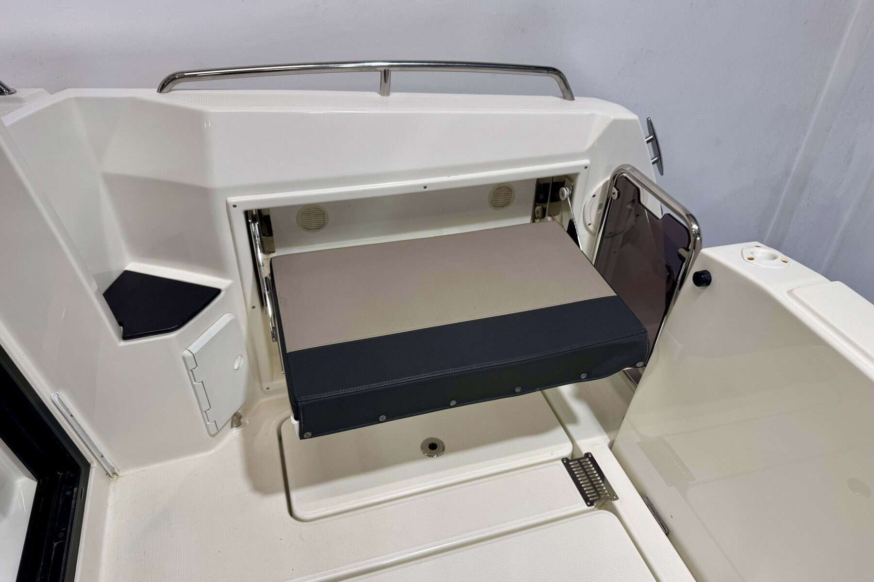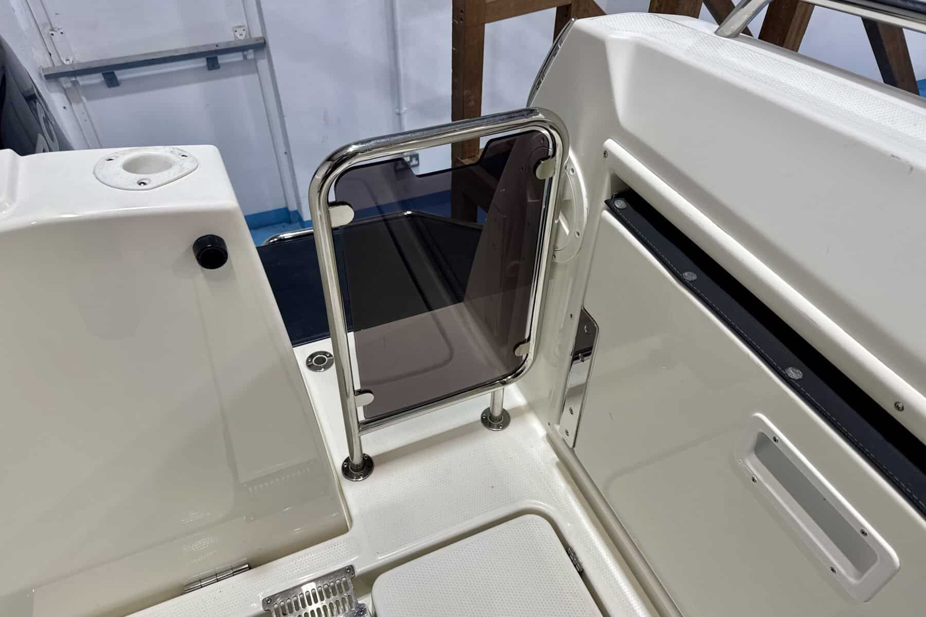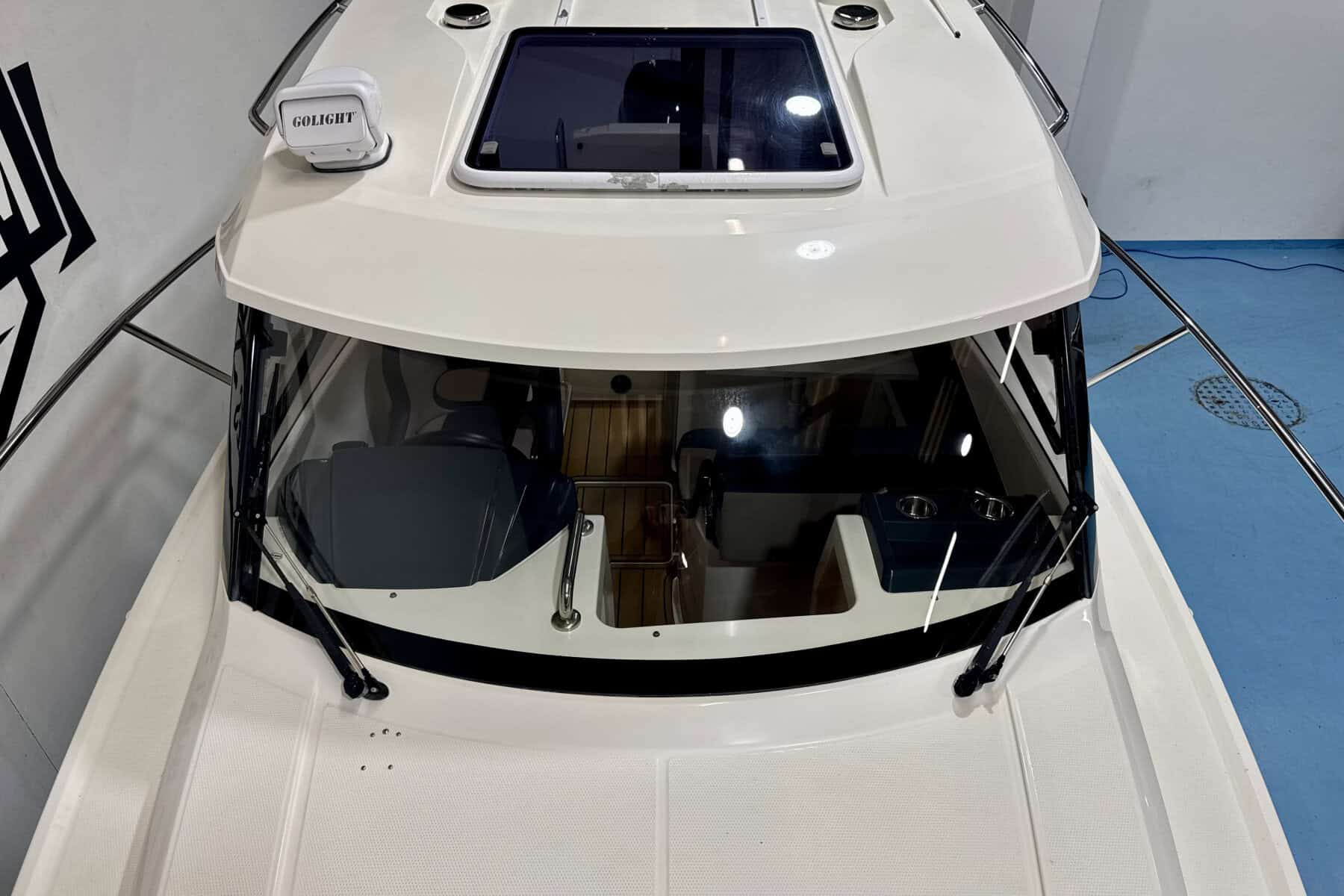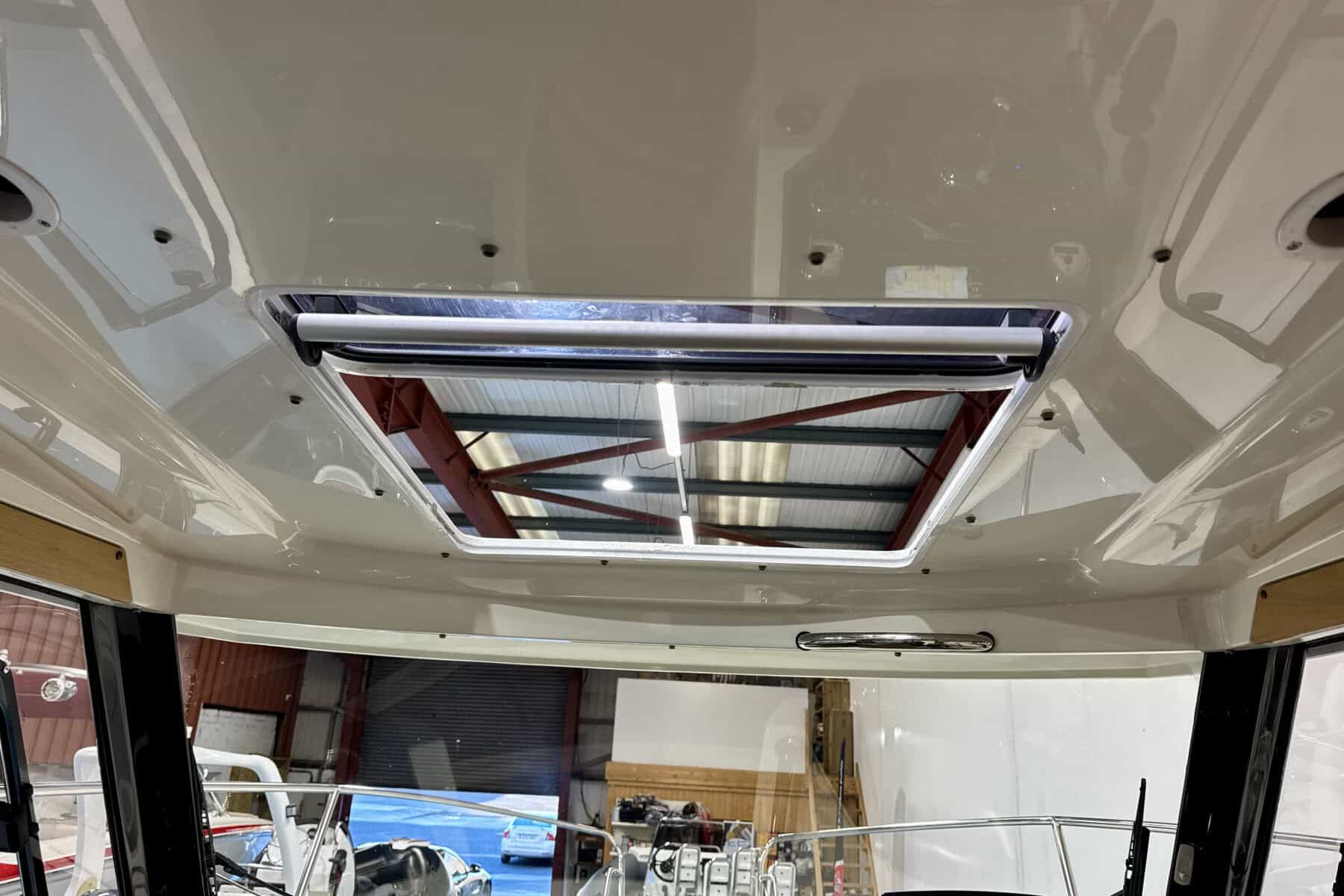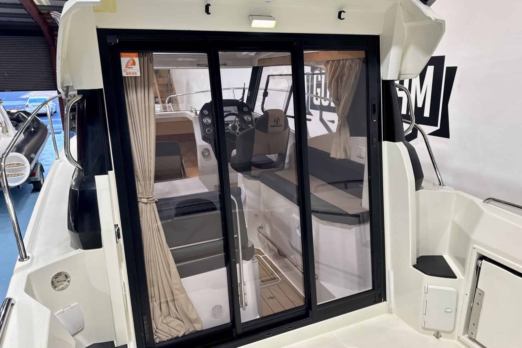 At the helm, everything falls neatly to hand. Clear sightlines, sensible ergonomics, and straightforward instrumentation create a driving position that inspires confidence. It’s a helm designed for real boating, comfortable for long stints underway and intuitive in close-quarters manoeuvring.
